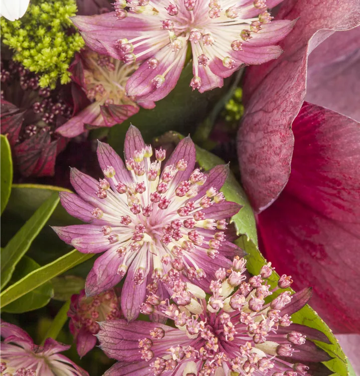 Astrantia major bildet sternförmige, in Dolden angeordnete, rosa-weiße Blüten ab Juni.