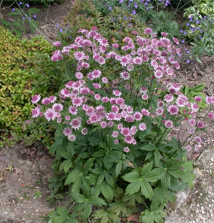 Die Große Sterndolde (Astrantia major) ist eine aufrechte Staude, die von Juni bis Juli rosa-weiße, sternförmige, in Dolden angeordnete Blüten bildet. Ihre handförmigen, Blätter sind mittelgrün. An einem halbschattigen Standort mit durchlässigem, humosem, nährstoffreichem Boden erreicht sie gewöhnlich eine Höhe von ca. 60 cm und wird ca. 45 cm breit. Die Große Sterndolde ist gut frostverträglich.
