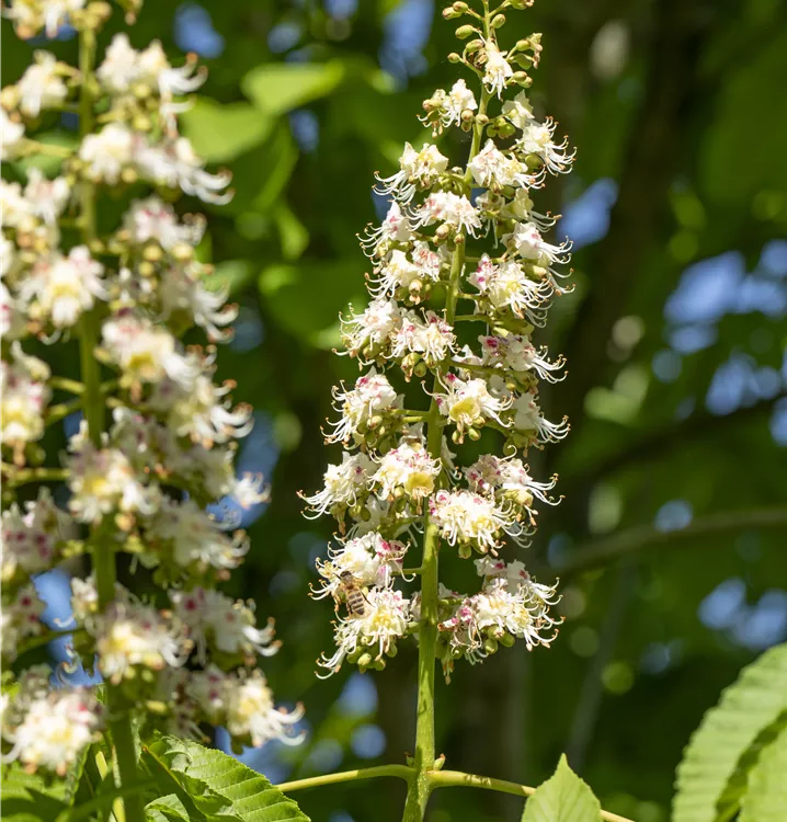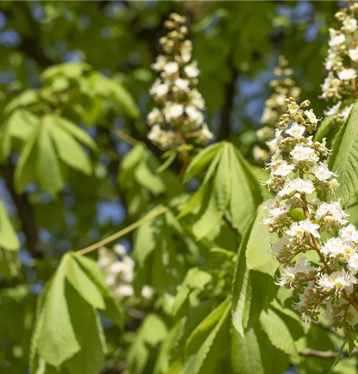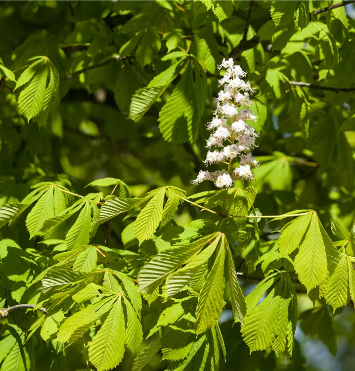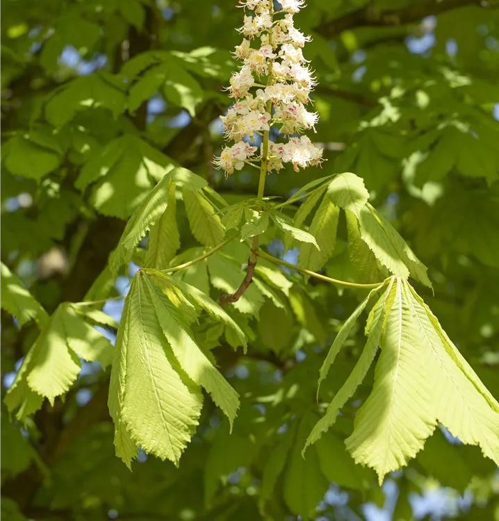 Die weißen Blüten der Rosskastanie erscheinen in Rispen im Mai.