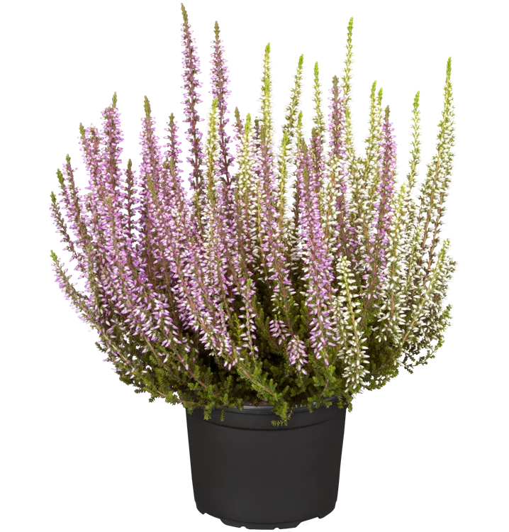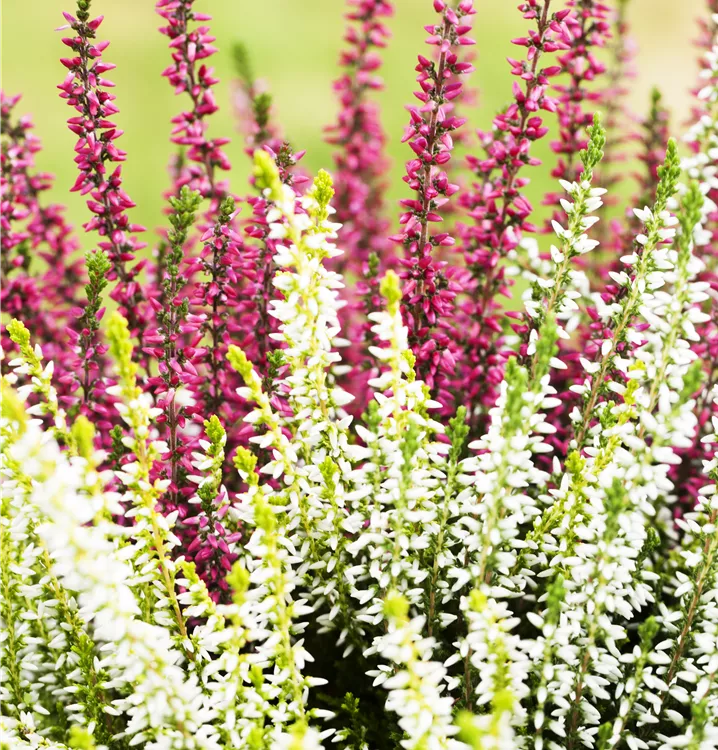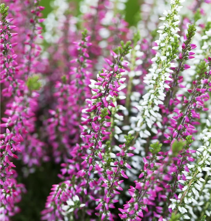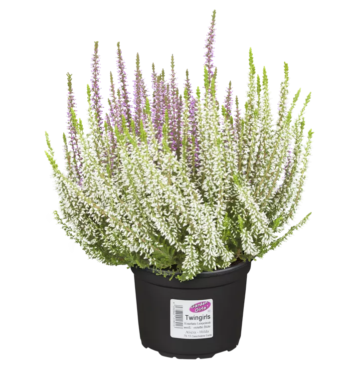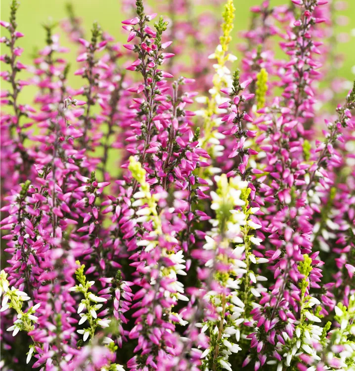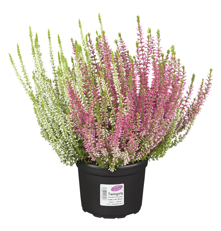 Die Winterharte Knospenheide Twingirls® (Calluna vulgaris) wird durch ihre unzähligen Knospenblüten in Zweifarbig jeden Garten verschönern. Ab September ist es soweit und sie begeistert in Beeten, sowie in Kübeln auf Balkon oder Terrasse. Doch auch die nadelförmigen, dunkelgrünen Blätter sind ein schöner Anblick.