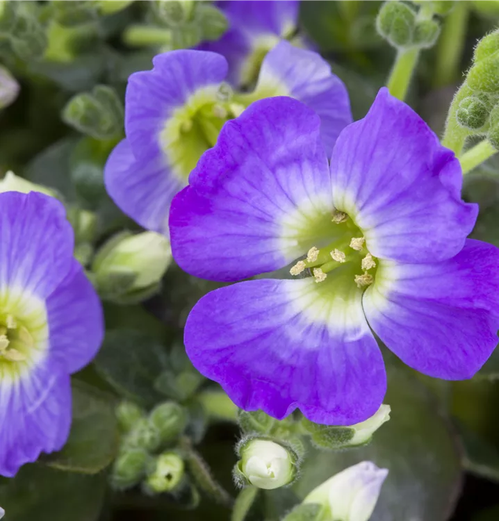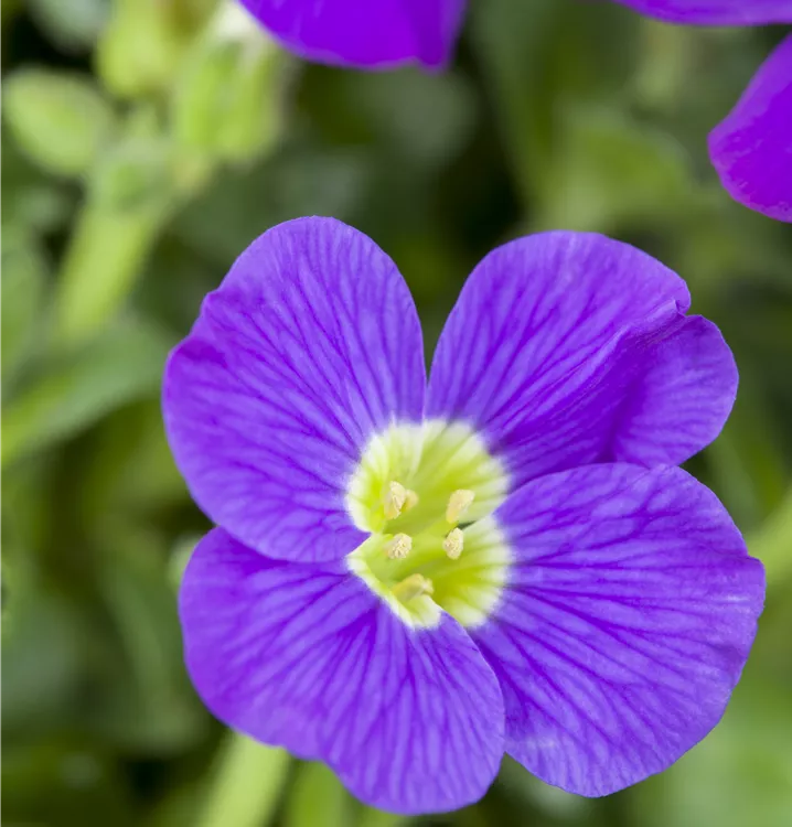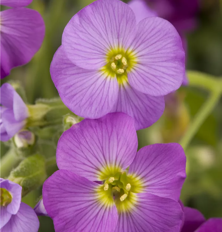 Aubrieta x cultorum bildet radförmige, blaue Blüten ab April.