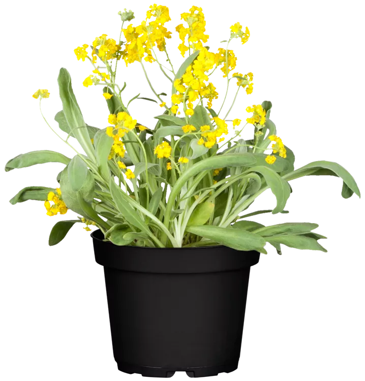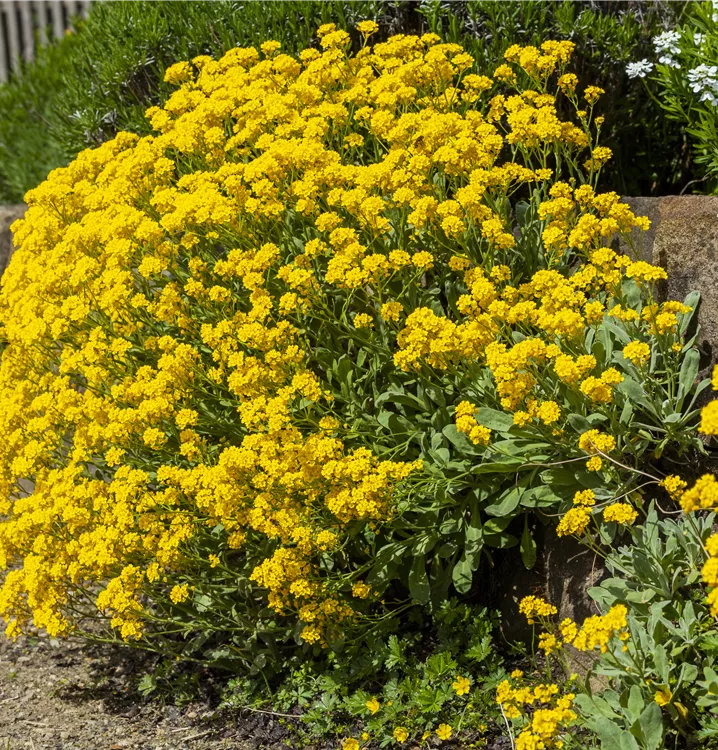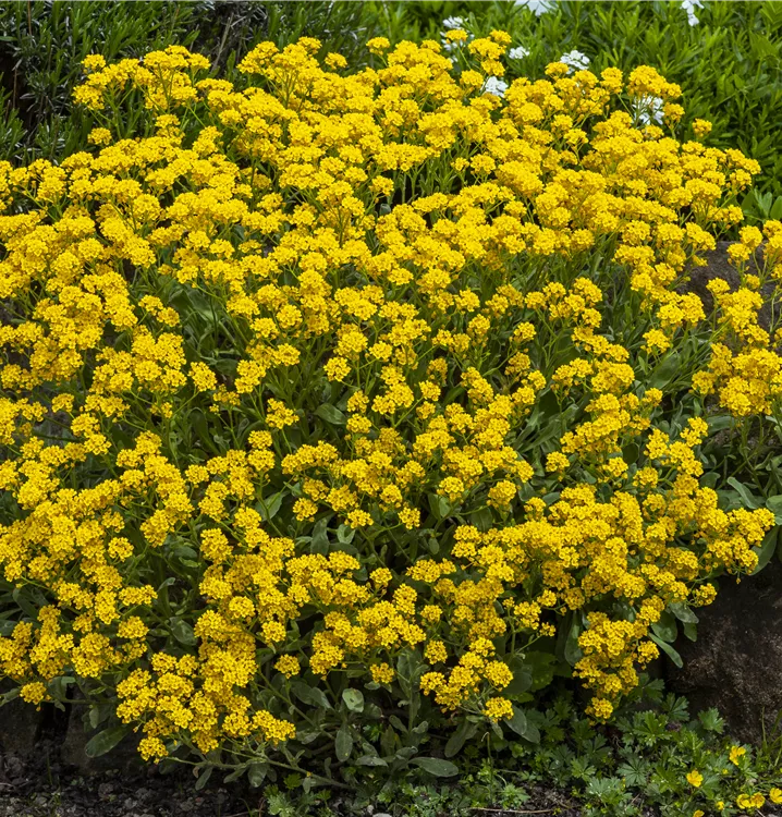 Aurinia saxatilis bildet radförmige, gelbe Blüten ab April.