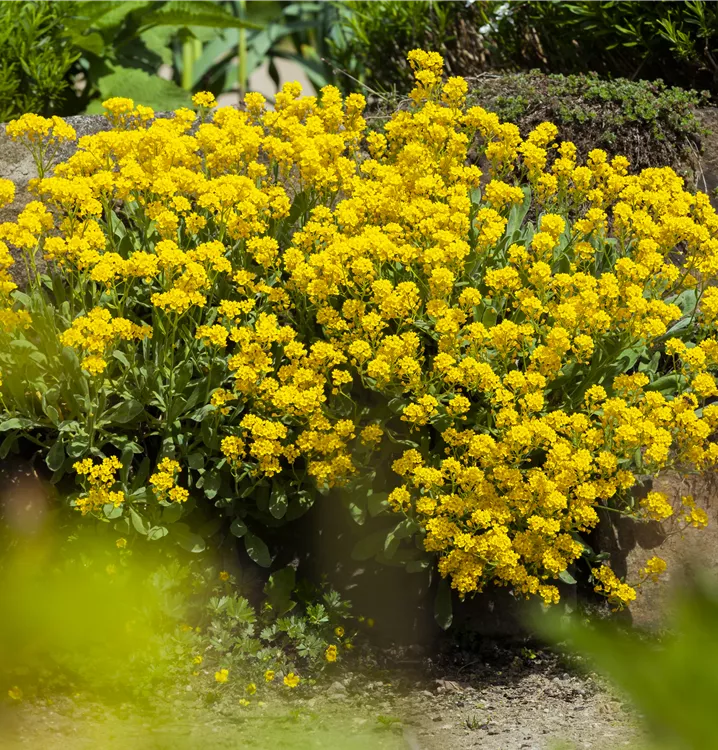 Das Felsen-Steinkraut (Aurinia saxatilis) ist eine kissenförmige, wintergrüne Staude, die von April bis Mai gelbe, radförmige Blüten bildet. Seine lanzettlichen, Blätter sind grau-grün. An einem sonnigen bis halbschattigen Standort mit durchlässigem, sandigem, lehmigem Boden erreicht es gewöhnlich eine Höhe von ca. 30 cm und wird ca. 40 cm breit. Das Felsen-Steinkraut ist gut frostverträglich.