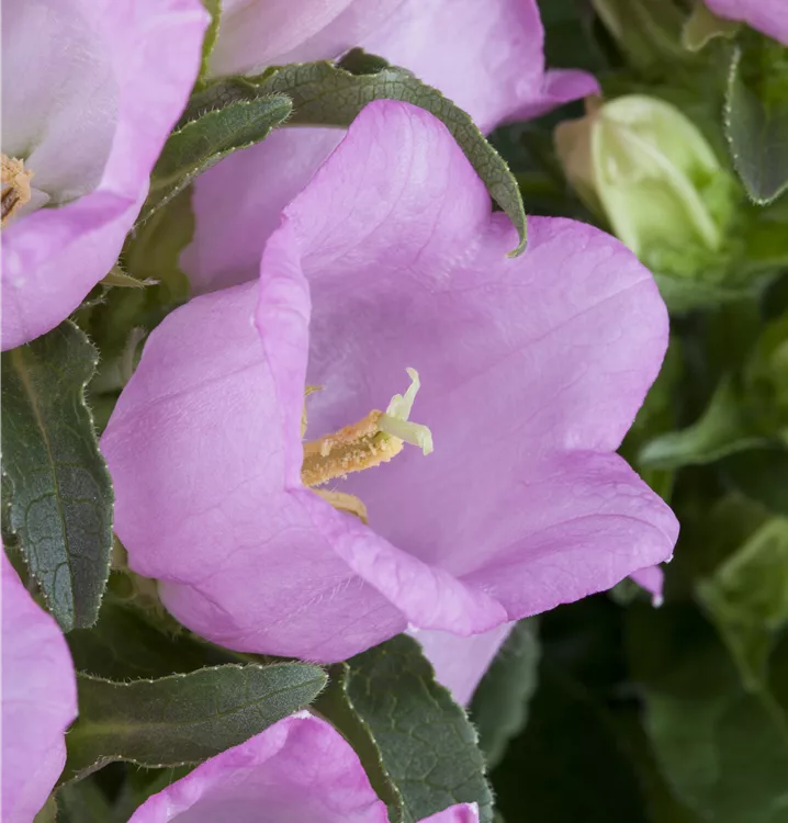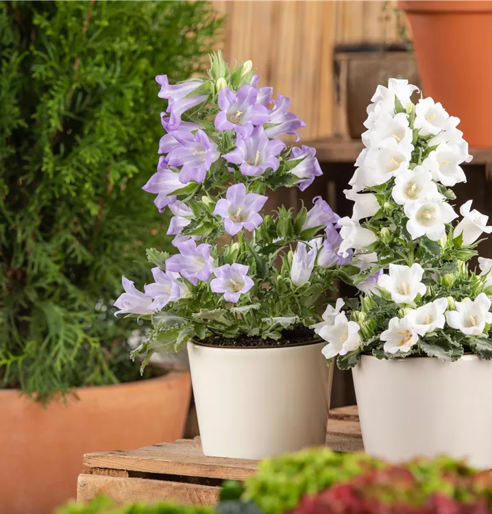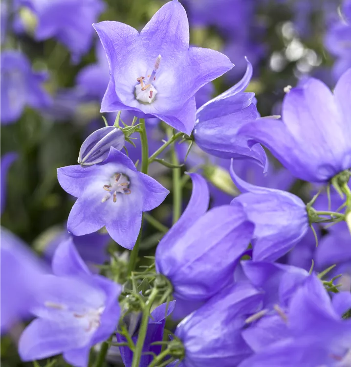 Campanula 'Mary Mee'® bildet glockenförmige, weiße, blaue, lilafarbene Blüten ab Juni.