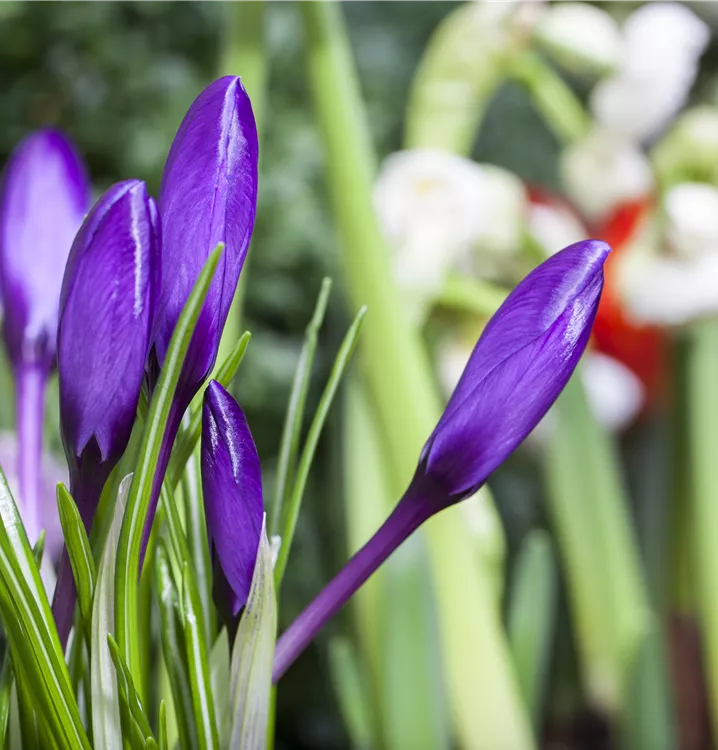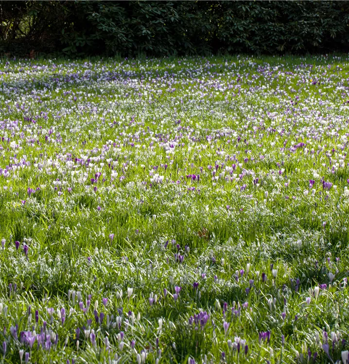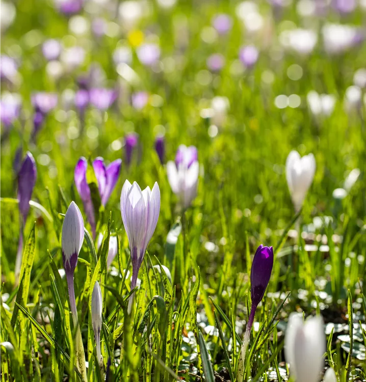 Der Frühlings-Krokus (Crocus vernus) bringt ansehnliche, weiße, lilafarbene, gelbe, blaue, angenehm duftende Blüten von Februar bis März hervor. Bevorzugt wird ein durchlässiger, nährstoffreicher, sandiger Boden in sonniger bis halbschattiger Lage. Die aufrechte Pflanze erreicht gewöhnlich eine Höhe von 10 - 15 cm und wird bis zu 5 cm breit.