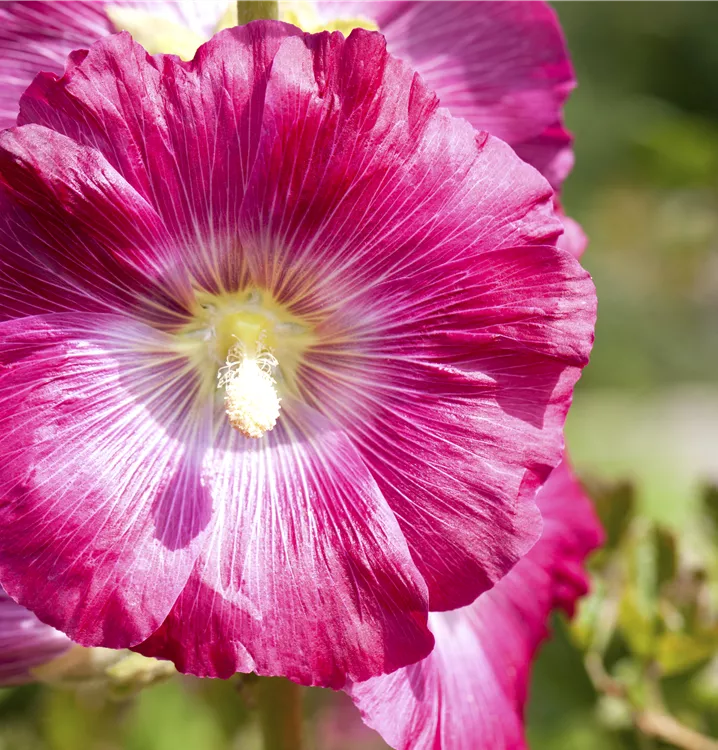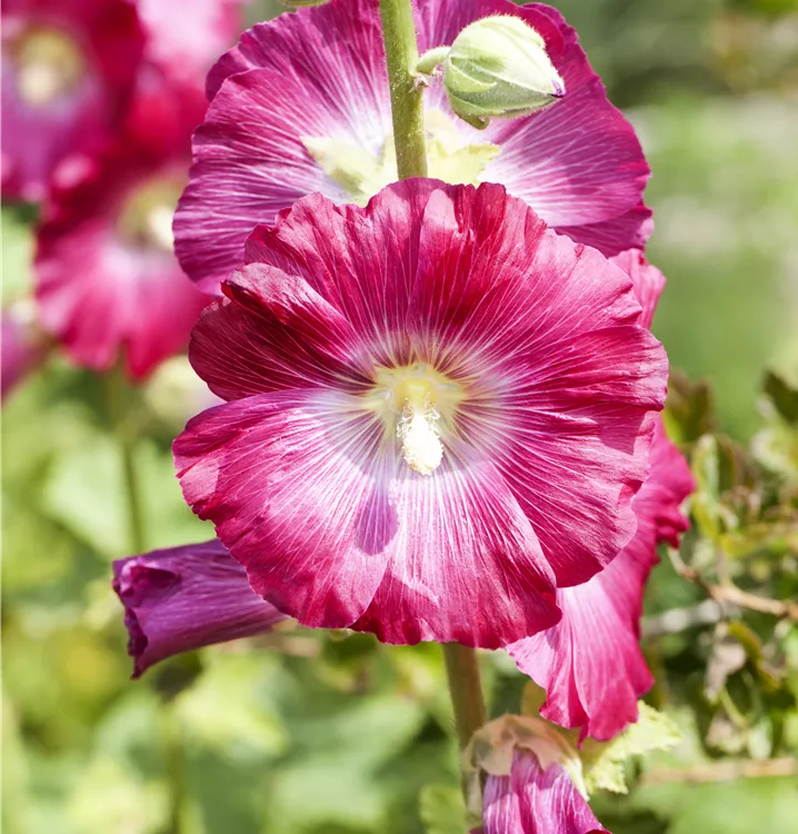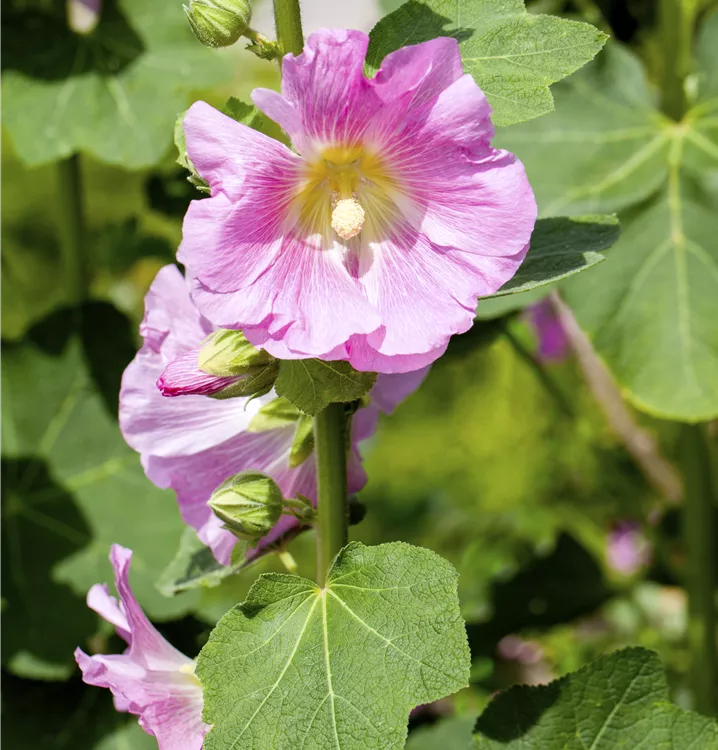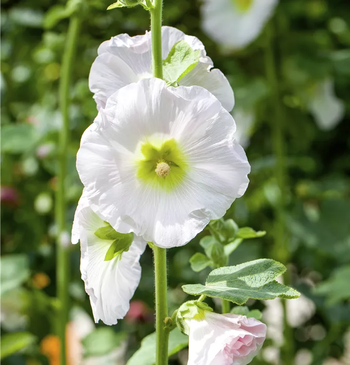 Alcea rosea bildet schalenförmige, in Trauben angeordnete, gelbe, lilafarbene, pinke, rosafarbene, weiße Blüten ab Juli.