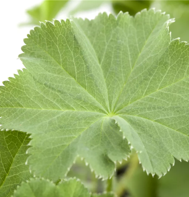 Die sommergrünen Blätter des Großblättrigen Frauenmantels sind grau-grün, rundlich, gelappt.