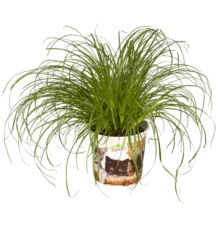 Das Katzengras (Cyperus zumula) trägt mittelgrüne, lanzettliche Blätter. Diese horstbildende und überhängende Pflanze gedeiht am besten an einem hellen Standort.