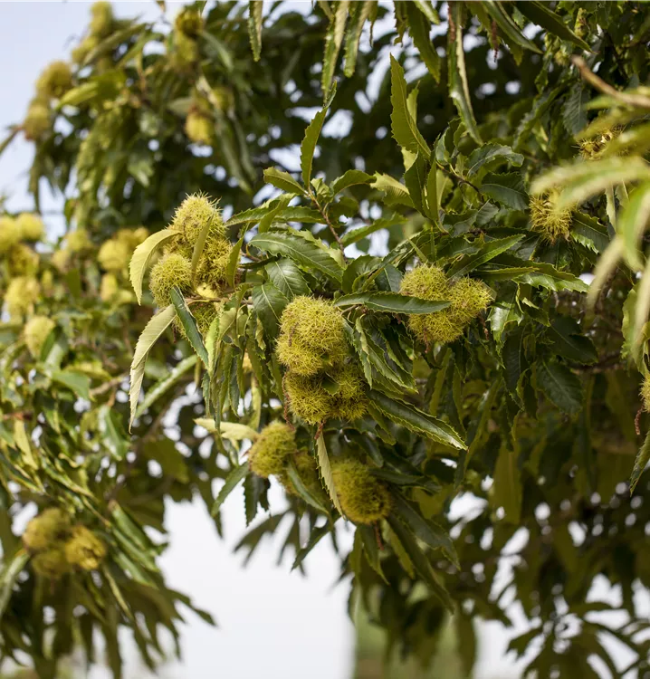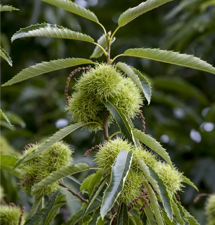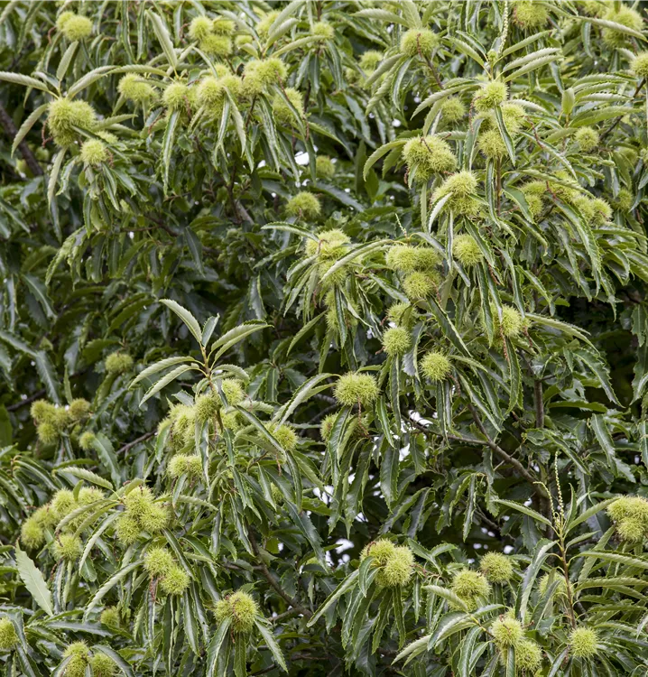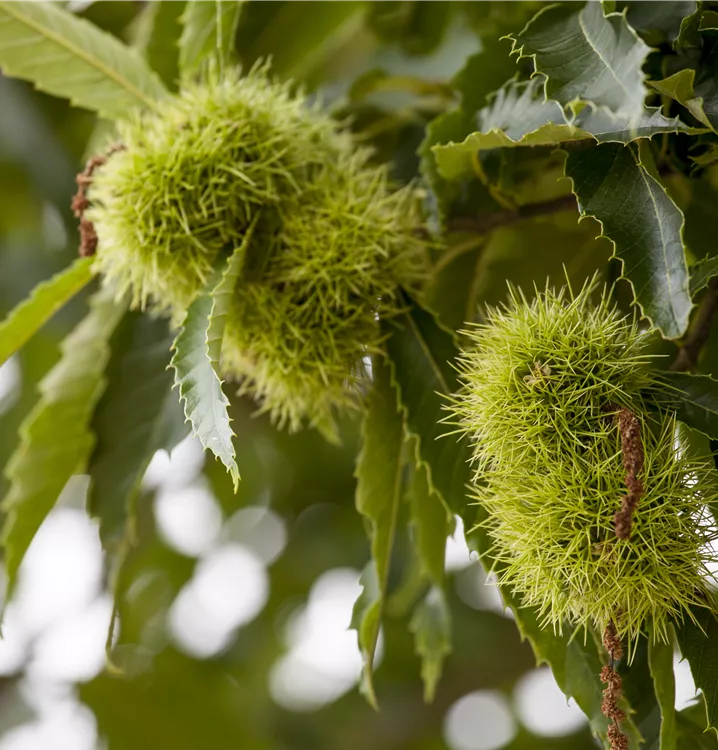 Castanea sativa bildet braune Früchte mit einem mehligen Geschmack. Die Fruchtschale ist stachelig. Reifezeit ab Oktober.