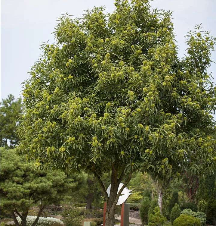 Die Esskastanie (Castanea sativa) ist ein ausladender Großbaum, der cremeweiße Blüten mit einem starken Duft hervorbringt. Sie erscheinen von Juni bis Juli. Aus diesen gehen ab Oktober braune Früchte hervor. Sie verströmen einen starken Duft. Zudem trägt die Esskastanie, glänzende, lanzettliche, dunkelgrüne Blätter. Ihre Rinde ist dunkelgrau, netzartig eingerissen. An einem sonnigen bis halbschattigen Standort mit durchlässigem, nährstoffreichem, saurem Boden erreicht sie gewöhnlich eine Höhe von ca. 30 m und wird ca. 15 m breit.
