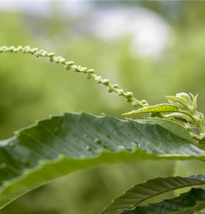 Die sommergrünen Blätter der Esskastanie sind dunkelgrün, lanzettlich, glänzend, wechselständig, gesägt. Esskastanie zeigt sich leuchtend goldgelb im Herbst.