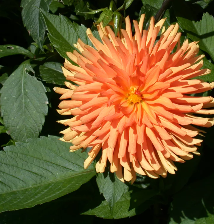 Die sommergrünen Blätter der Kaktus-Dahlie sind mittelgrün, eiförmig, gezähnt.