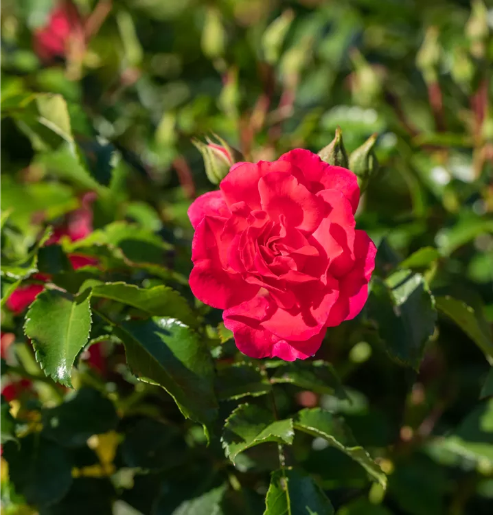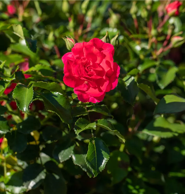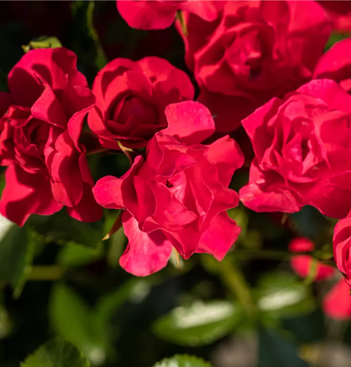 Die Bodendeckerrose (Rosa) ist eine reichblühende Rose, die im Garten eine besondere Rolle spielt. Die zahlreichen gefüllten Blüten erscheinen von Juni bis Oktober. Mit dem breiten und flachen Wuchs wird dieser Zwergstrauch bis zu 50 cm hoch und 50 cm breit.