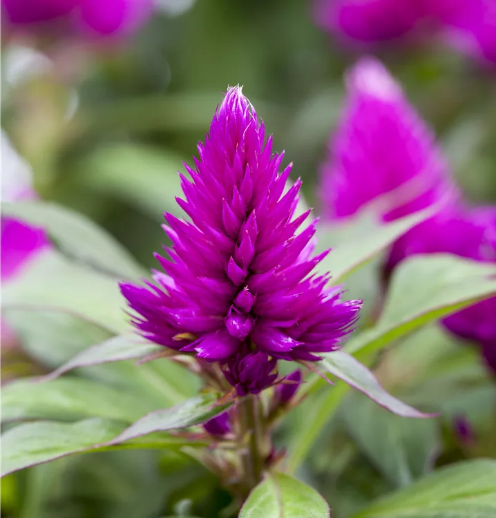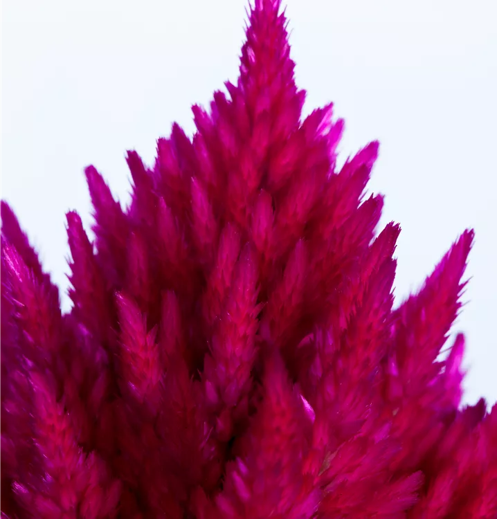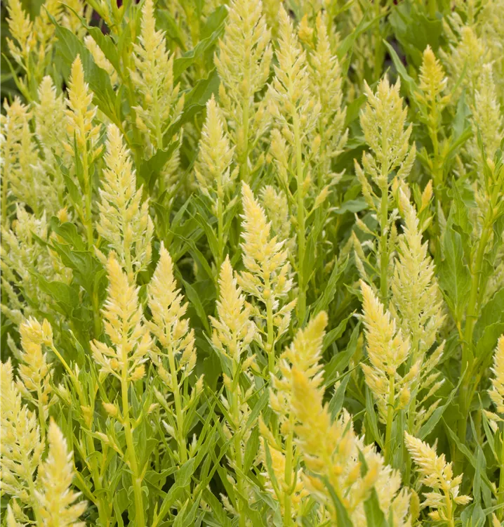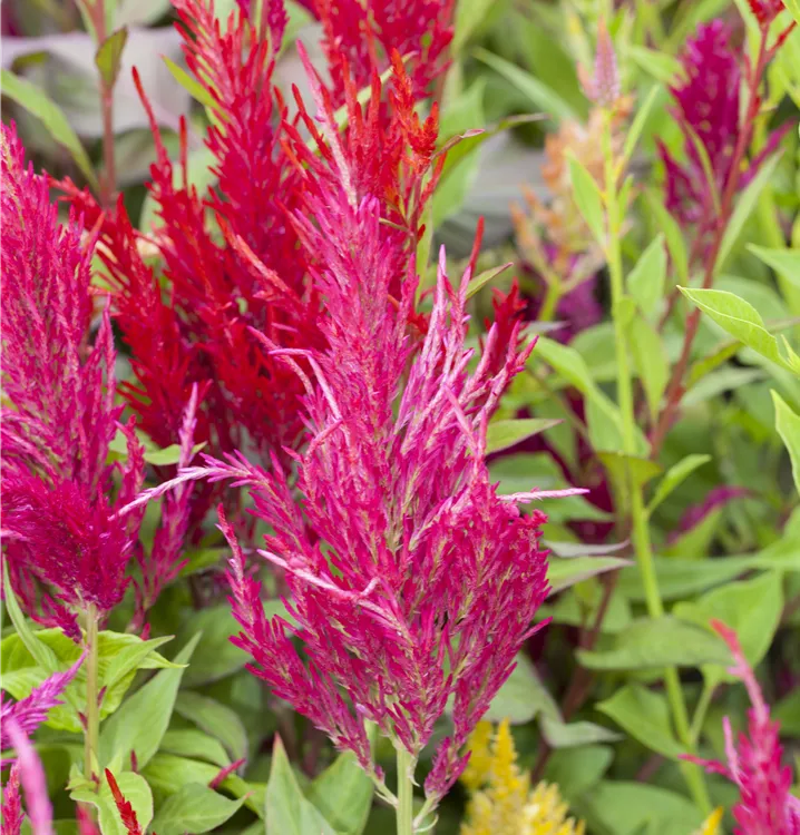 Die Federbusch-Celosie (Celosia argentea var. plumosa) ist eine beliebte Pflanze für den Balkon, die während der gesamten Saison unzählige gelbe, rote oder orangefarbene Blüten bildet. Ein sonniger Standort und ein durchlässiges Substrat werden bevorzugt.