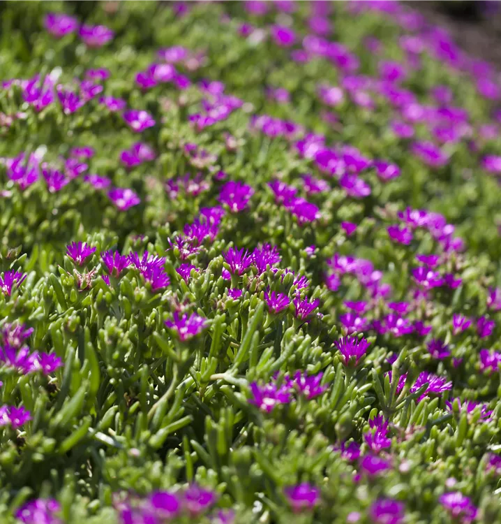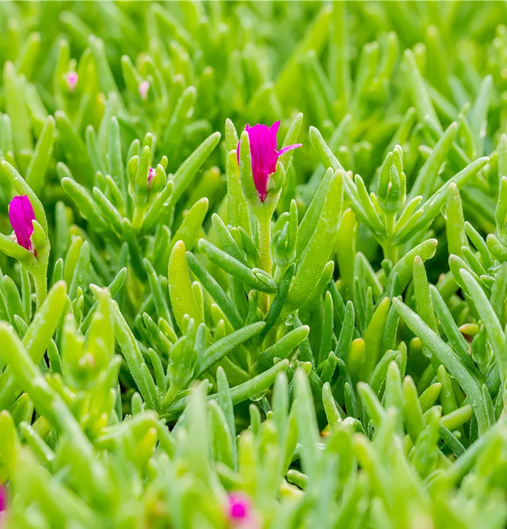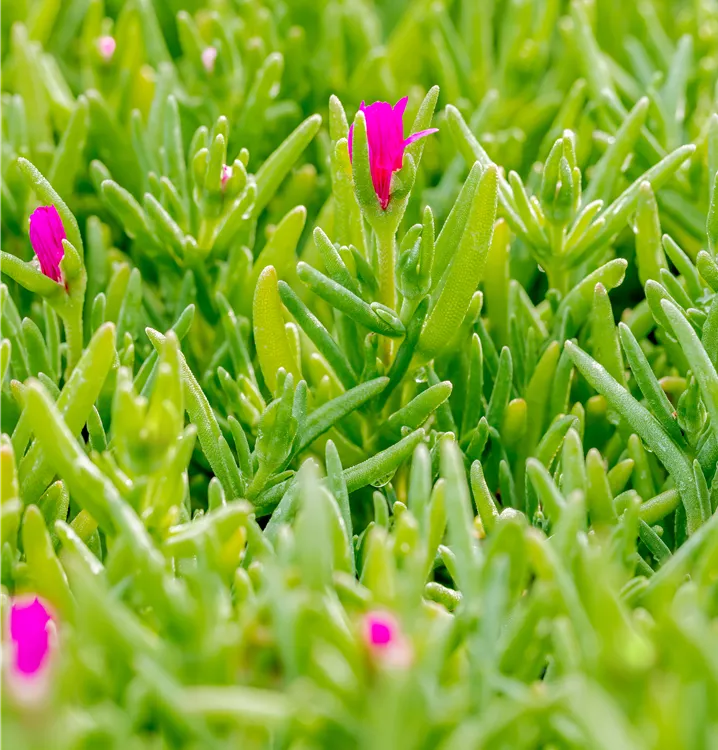 Delosperma cooperi bildet strahlenförmige, körbchenartige, rosafarbene Blüten ab Juni.