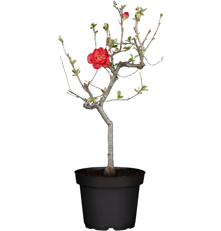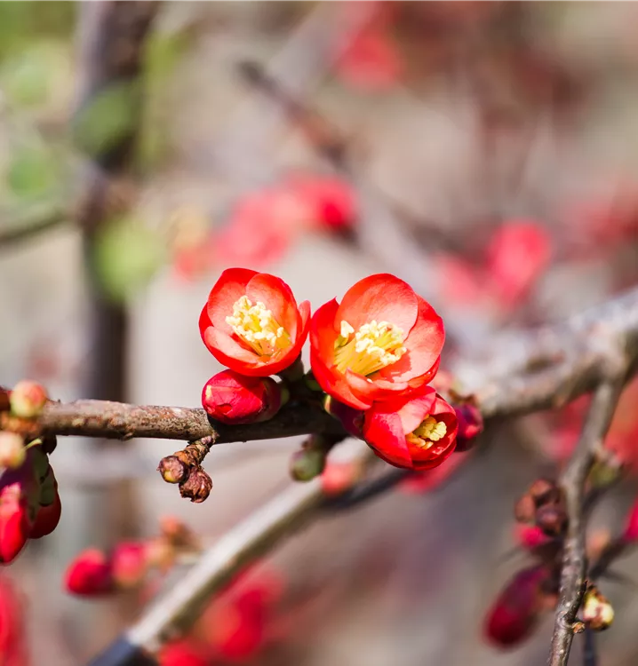 Die Niedrige Scheinquitte (Chaenomeles japonica) ist ein ausladender Kleinstrauch mit dekorativen, gelben, orangefarbenen, birnenförmigen Früchten. Diesen voraus bringt sie von Mai bis Juni rote Blüten hervor. Zudem trägt die Niedrige Scheinquitte, eiförmige, mittelgrüne Blätter. An einem sonnigen bis halbschattigen Standort erreicht sie gewöhnlich eine Höhe von ca. 1,5 m und wird ca. 1,2 m breit. An den Boden stellt die Niedrige Scheinquitte keine besonderen Ansprüche.