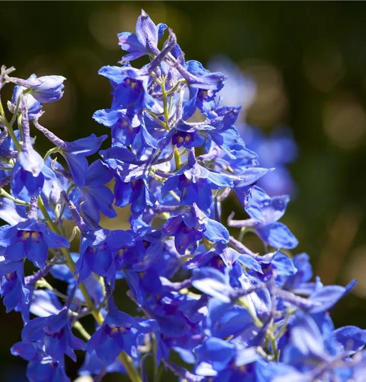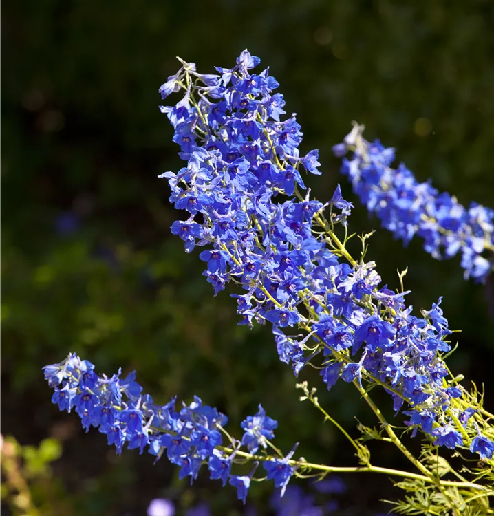Delphinium x cultorum bildet trichterförmige, violette, blaue, weiße Blüten ab Juni. Bei richtiger Pflege Nachblüte von September bis Oktober.