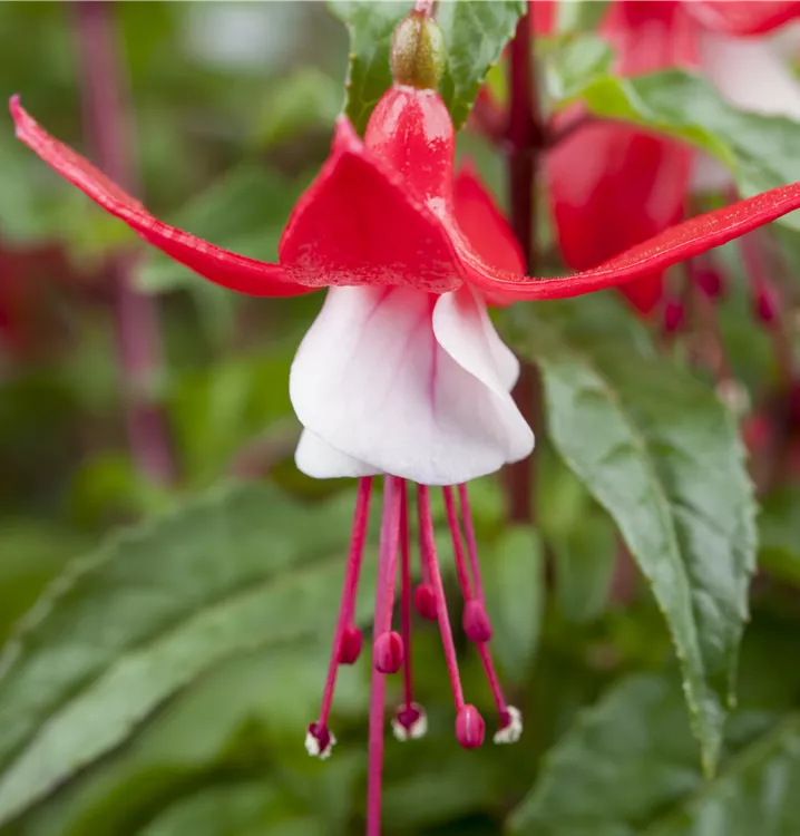 Die Fuchsien Hybriden (Fuchsia) ist eine sehr beliebte, sommergrüne Kübelpflanze. Ihre dekorativen Blüten sind glockenförmig und erscheinen von Juni bis September. Der Standort sollte möglichst sonnig bis halbschattig und geschützt sein. Eine durchlässige und humose Erde ist dabei ideal. Bei günstigen Bedingungen erreicht die Fuchsien Hybriden eine Höhe von ca. 50 cm und wird bis zu 40 cm breit.