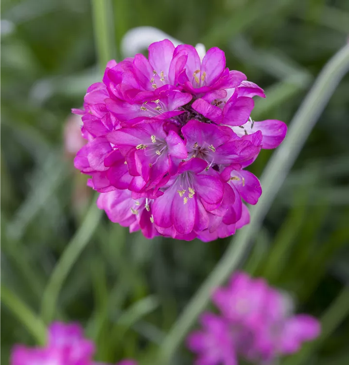 Die Strand-Grasnelke (Armeria maritima) ist eine aufrechte, horstbildende, wintergrüne Staude, die von Mai bis Juli rosafarbene oder weiße, ballförmige Blüten bildet. Ihre linealen, Blätter sind grau-grün. An einem sonnigen Standort mit durchlässigem, nährstoffreichem, sandigem Boden erreicht sie gewöhnlich eine Höhe von ca. 20 cm und wird ca. 20 cm breit. Die Strand-Grasnelke ist gut frostverträglich.