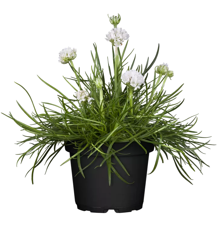Armeria maritima bildet ballförmige, rosafarbene, weiße Blüten ab Mai.