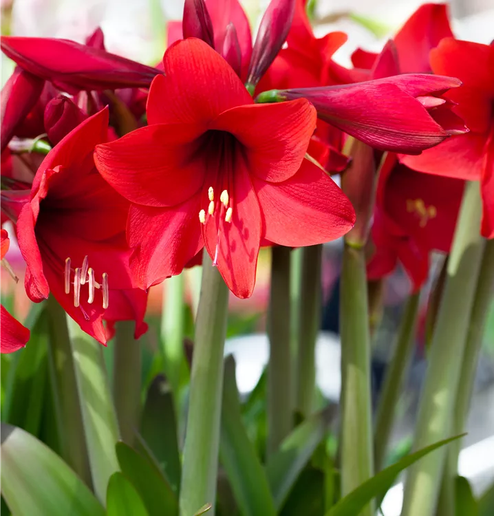 Der Ritterstern (Hippeastrum) bringt ansehnliche, rot-weiße Blüten von Oktober bis April hervor. Bevorzugt wird ein durchlässiger, nährstoffreicher Boden in sonniger bis halbschattiger Lage. Die schlanke, aufrechte Pflanze erreicht gewöhnlich eine Höhe von 40 - 50 cm und wird bis zu 30 cm breit.