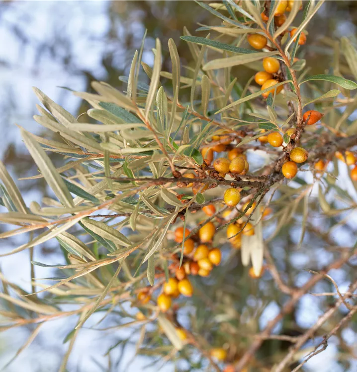 Der Sanddorn (Hippophae rhamnoides) bildet orange-rote Beeren. Diese sind saftig und säuerlich, aromatisch im Geschmack. Für eine ertragreiche Ernte ab August schaffen durchlässiger, kalkhaltiger, sandiger Boden und ein sonniger Standort optimale Bedingungen.