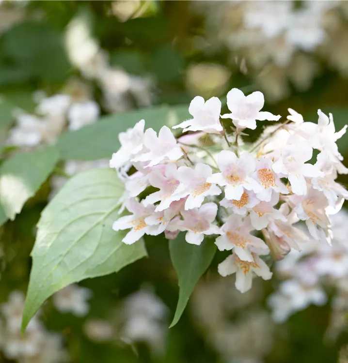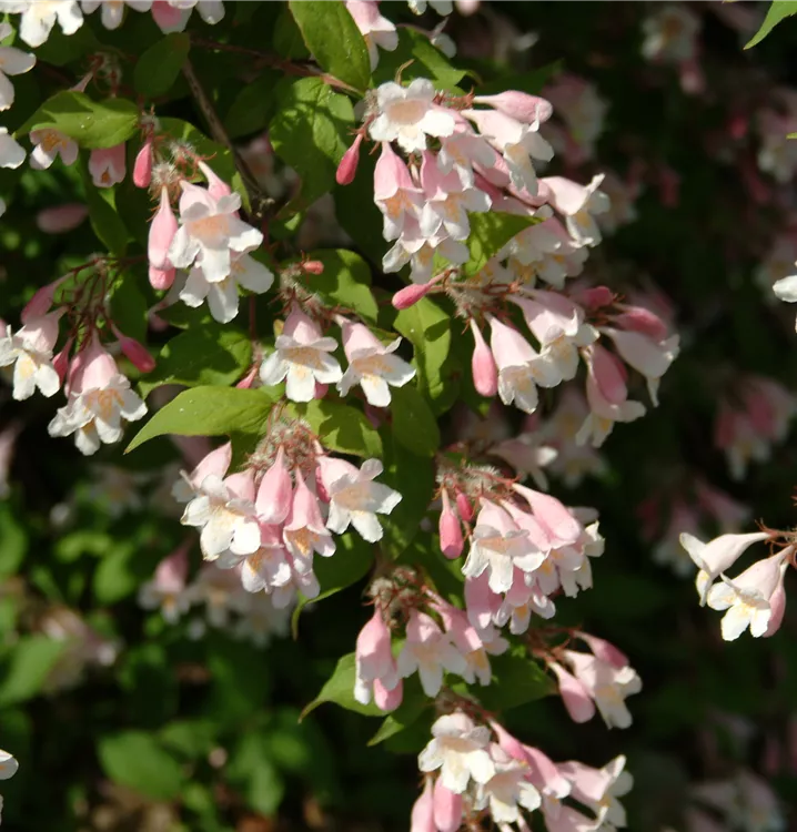 Die hellrosafarbenen, trichterförmigen Blüten des Perlmuttstrauch erscheinen in Doldentrauben von Mai bis Juni. Diese sind angenehm duftend.