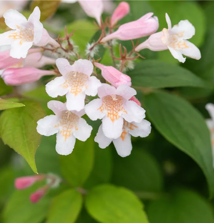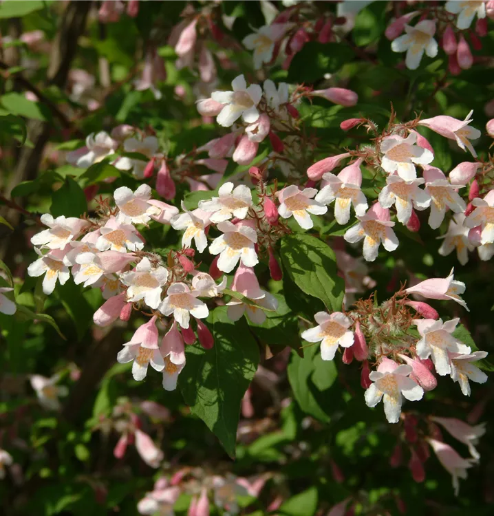 Der Perlmuttstrauch (Kolkwitzia amabilis) ist ein überhängender Strauch, der hellrosafarbene, trichterförmige, in Doldentrauben angeordnete Blüten mit einem angenehmen Duft hervorbringt. Sie erscheinen von Mai bis Juni. Aus diesen gehen dunkelgraue Früchte hervor. Sie verströmen einen angenehmen Duft. Zudem trägt der Perlmuttstrauch, lanzettliche, mittelgrüne Blätter. Seine Rinde ist rot-braun, abblätternd. An einem sonnigen bis halbschattigen Standort erreicht er gewöhnlich eine Höhe von ca. 4 m und wird ca. 3 m breit. An den Boden stellt der Perlmuttstrauch keine besonderen Ansprüche.