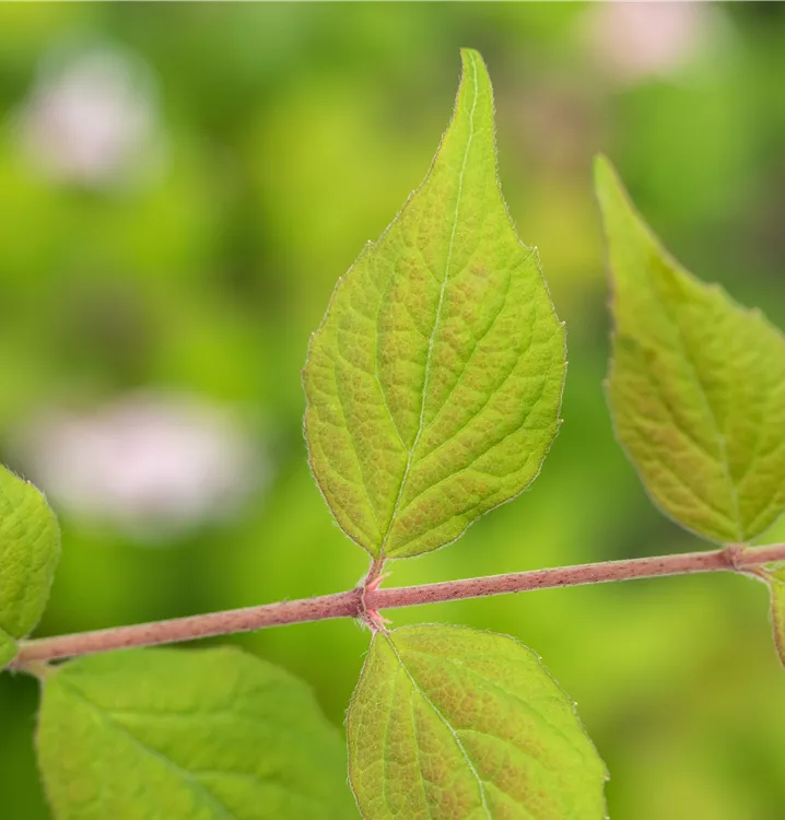 Die sommergrünen Blätter des Perlmuttstrauchs sind mittelgrün, lanzettlich, gegenständig, gesägt. Diese sind etwa 3 - 7 cm groß. Perlmuttstrauch zeigt sich leuchtend rot im Herbst.