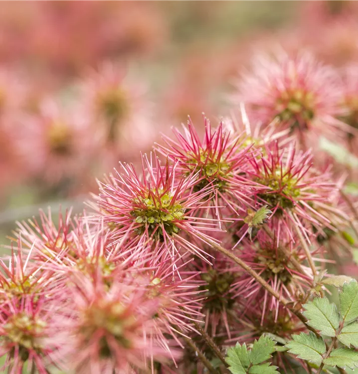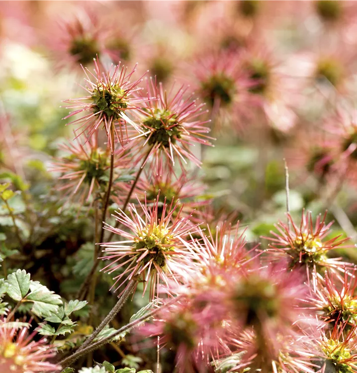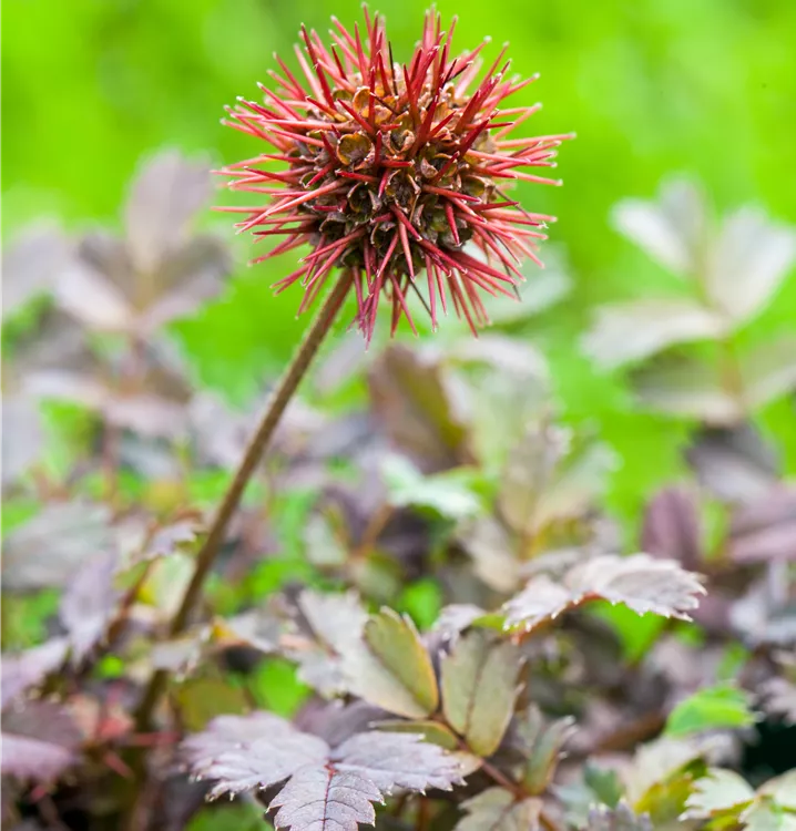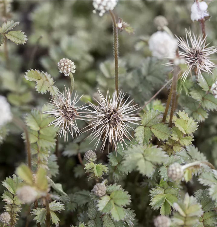 Besonders dekorativ sind die bronzefarbenen Früchte von Acaena microphylla. Diese erscheinen ab August.