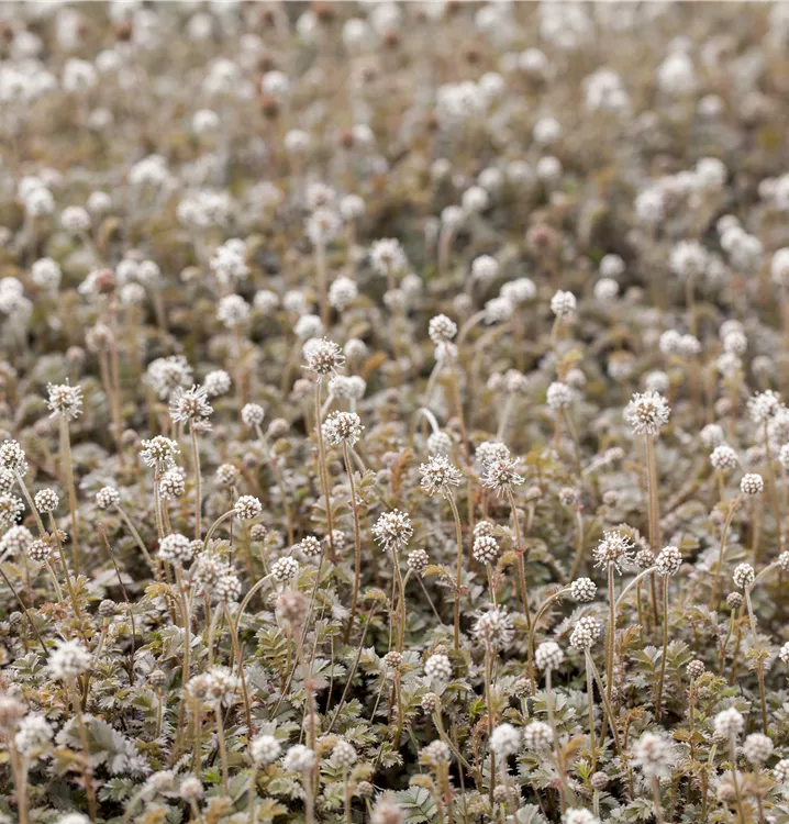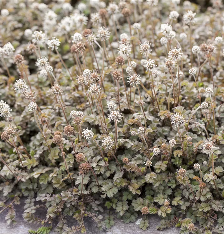 Acaena microphylla bildet ballförmige, cremeweiße Blüten ab Juni.