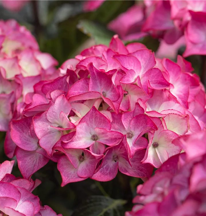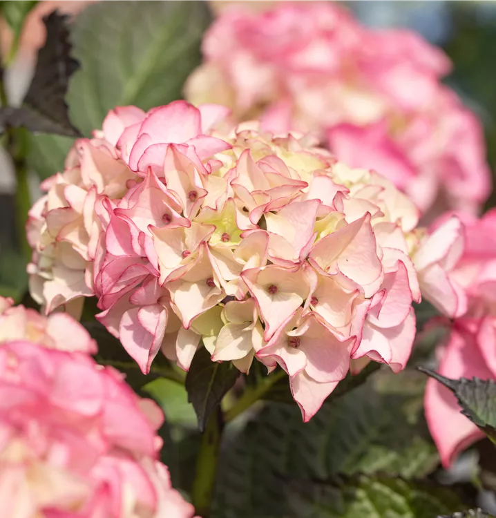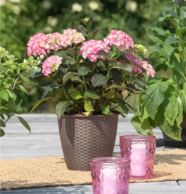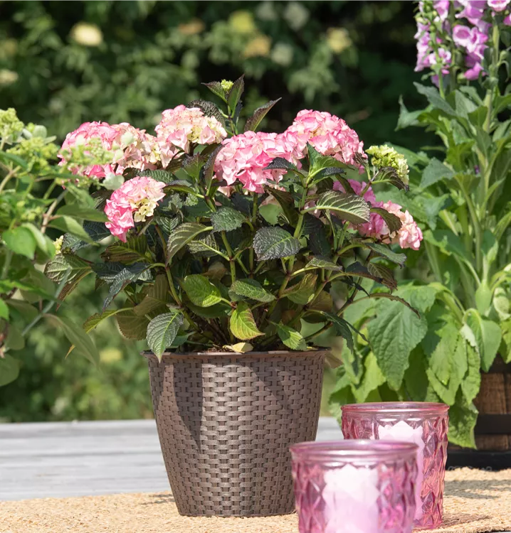 Die rosafarbenen, schalenförmigen Blüten der Gartenhortensie 'Black Diamonds'® erscheinen in Dolden von Juni bis September.