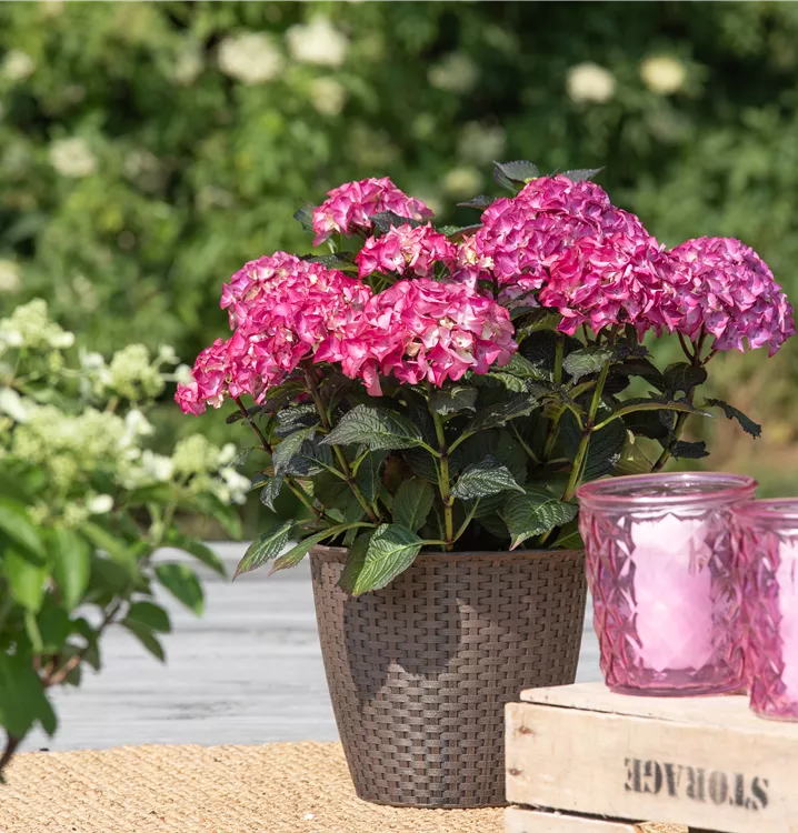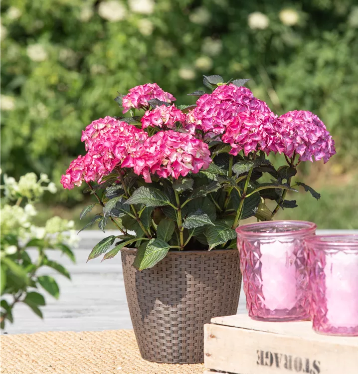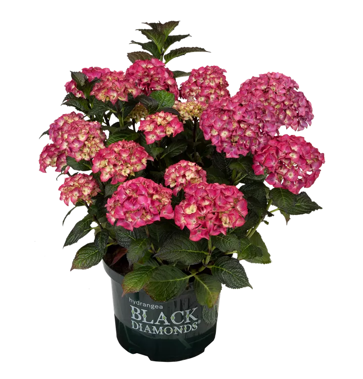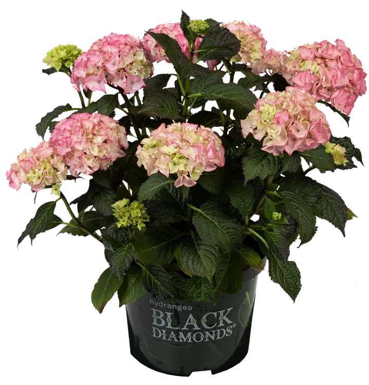 Die Gartenhortensie 'Black Diamonds'® (Hydrangea macrophylla) ist ein buschiger, aufrechter Kleinstrauch, der rosafarbene, schalenförmige, in Dolden angeordnete Blüten hervorbringt. Sie erscheinen von Juni bis September. Zudem trägt die Gartenhortensie 'Black Diamonds'®, eiförmige, dunkelgrüne, hellgrün geäderte Blätter. An einem halbschattigen bis schattigen Standort mit humosem, schwachsaurem Boden erreicht sie gewöhnlich eine Höhe von ca. 1,5 m und wird ca. 1,5 m breit.