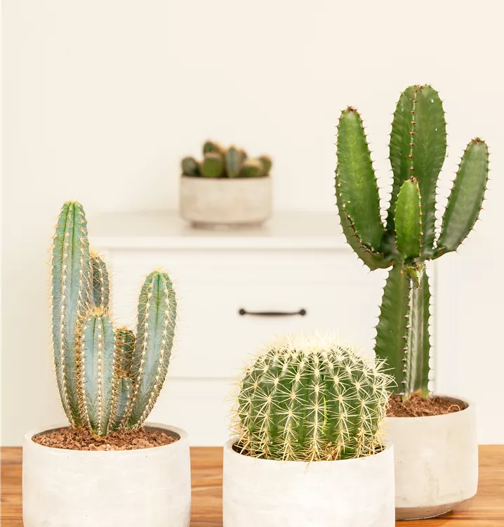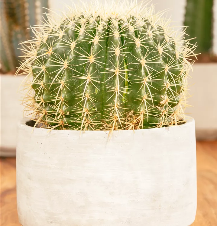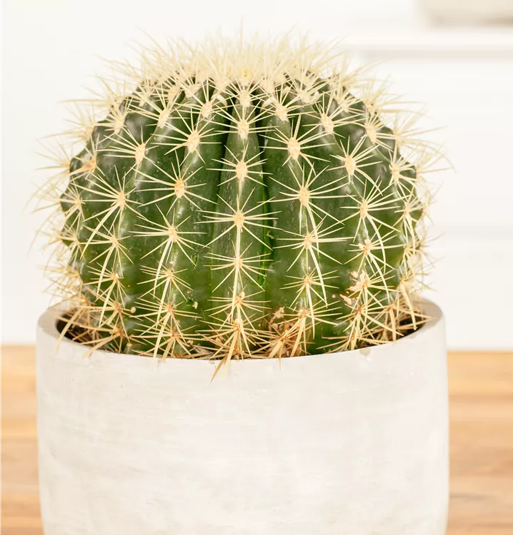 Der Schwiegermuttersessel (Echinocactus grusonii) ist ein kugelförmige, dunkelgrüne Pflanze mit charakteristischen Dornen, die bis zu 1,2 m hoch und 80 cm breit werden kann. An einem sonnigen Standort gedeiht er am besten. Bei guten Bedingungen sind von Juni bis August gelbe, trichterförmige Blüten möglich.