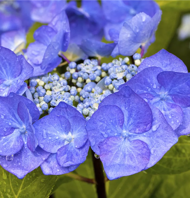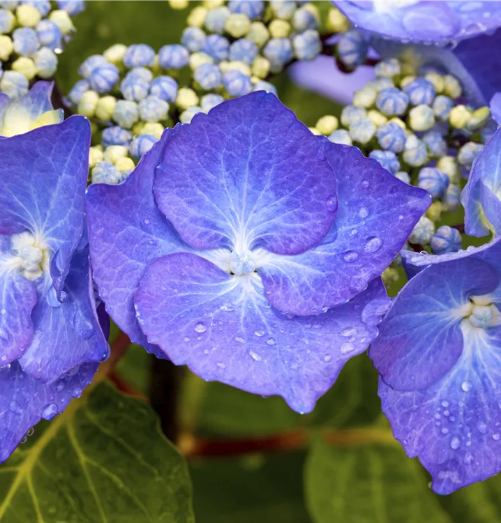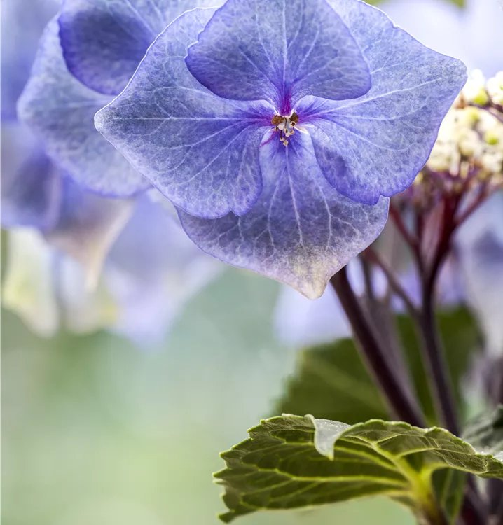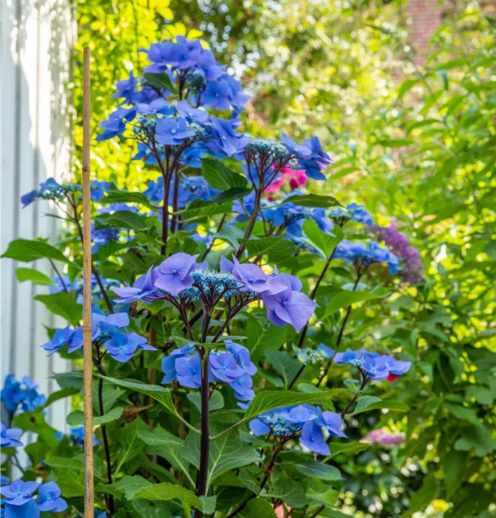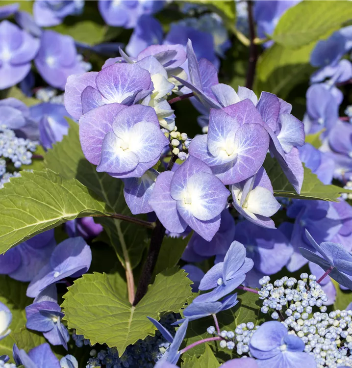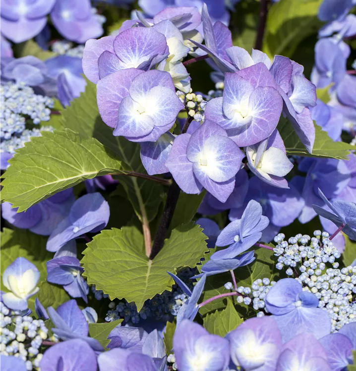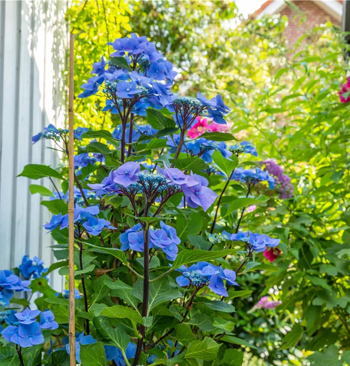 Die blauen, rosafarbenen, roten, weißen, schalenförmigen Blüten der Gartenhortensie 'Black Steel'® erscheinen in Dolden von Juni bis September.