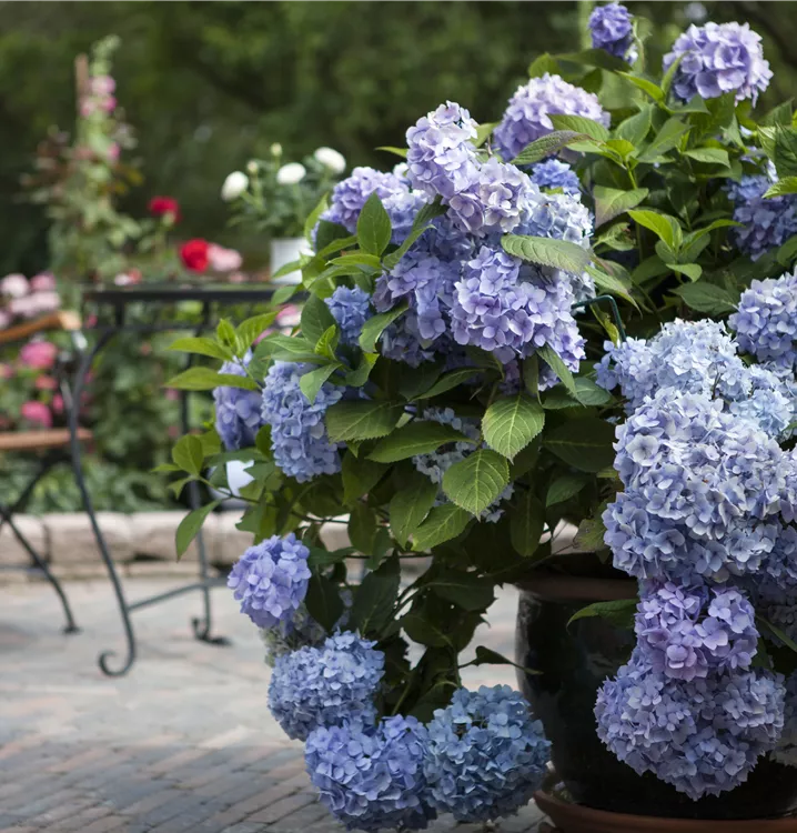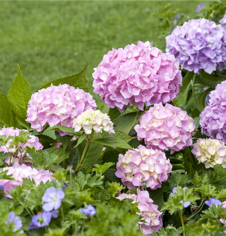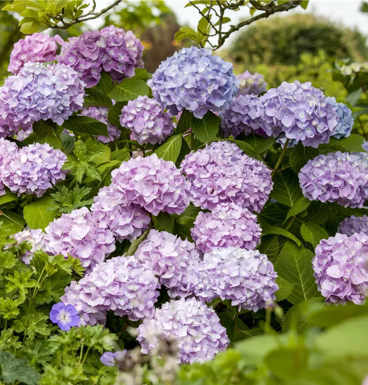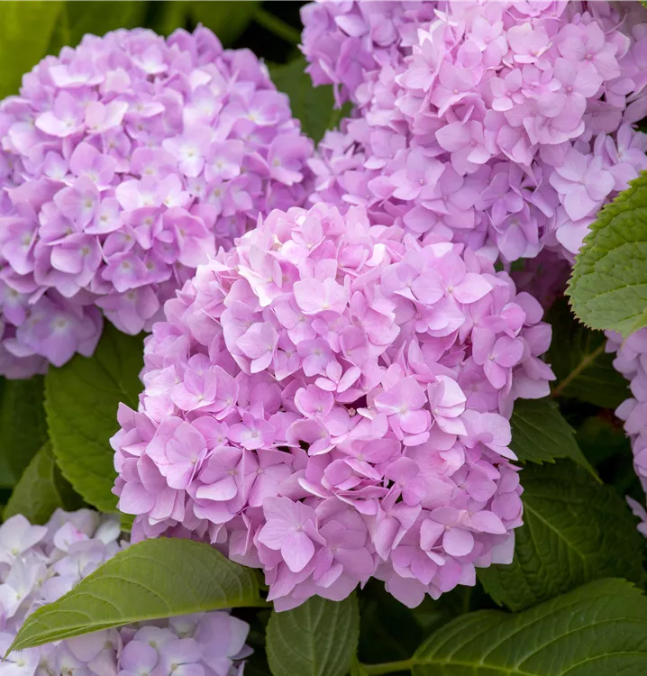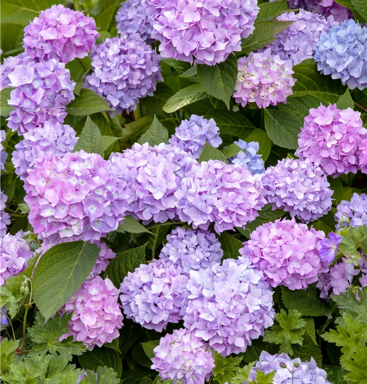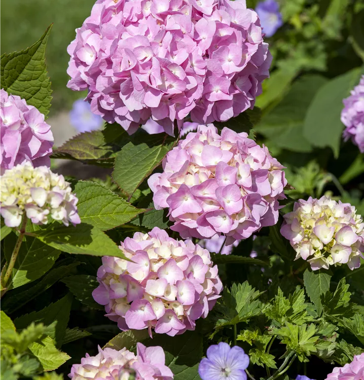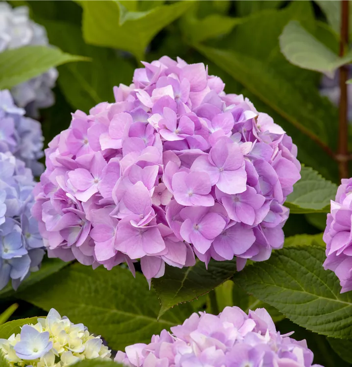Hydrangea macrophylla 'Endless Summer'® bringt von Mai bis Oktober blaue, rosafarbene, ballförmige Blüten hervor.