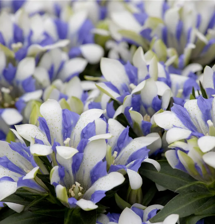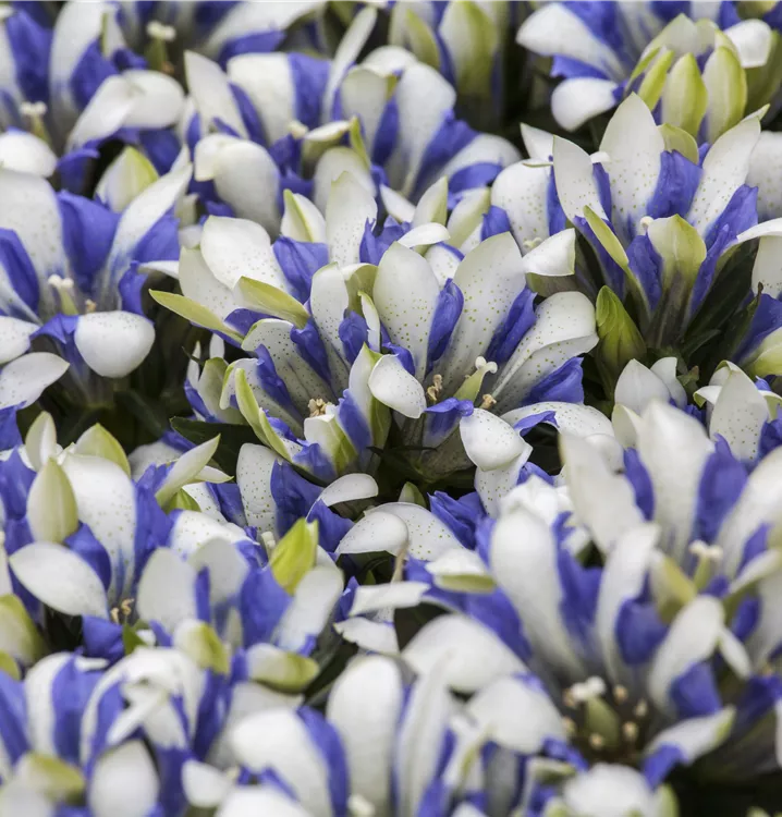 Gentiana scabra bildet blaue, weiße Blüten ab Juli.