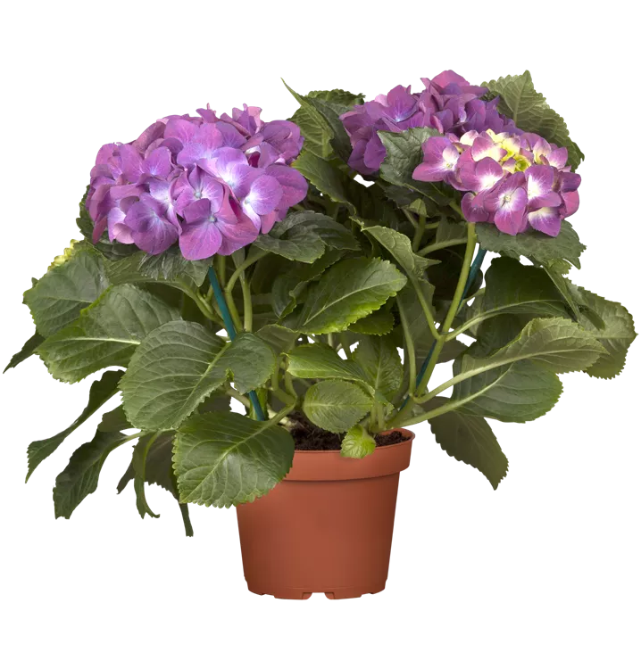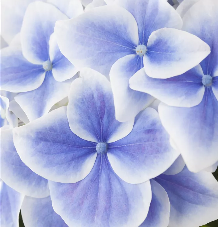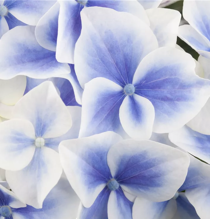 Die blauen, rosafarbenen, roten, weißen, schalenförmigen Blüten der Bauernhortensie erscheinen in Dolden von Juni bis September.