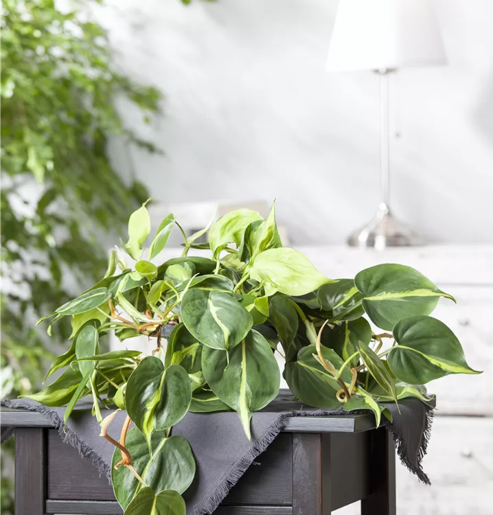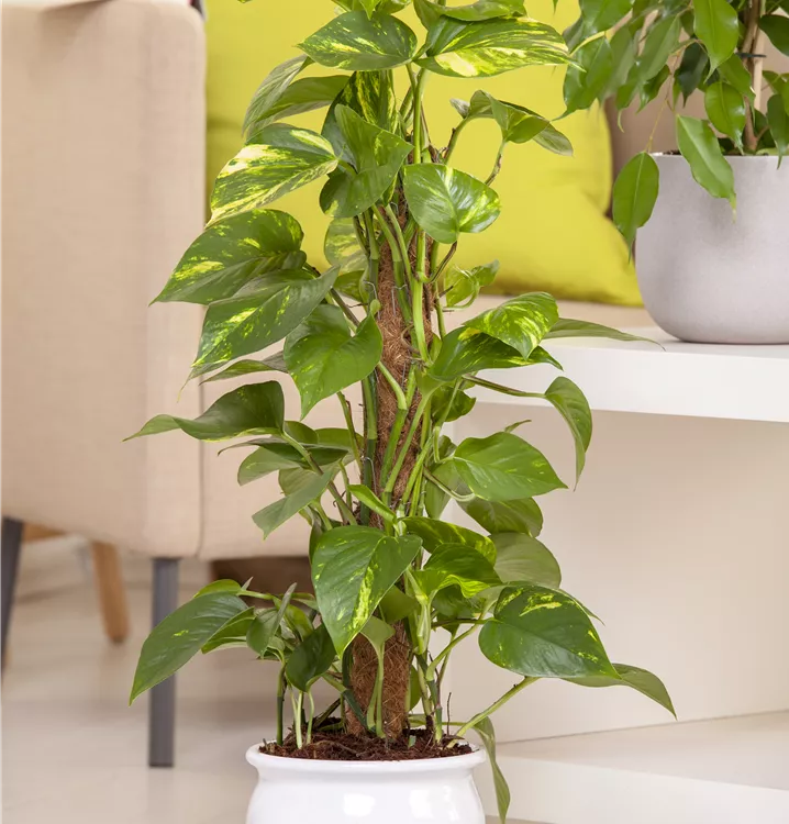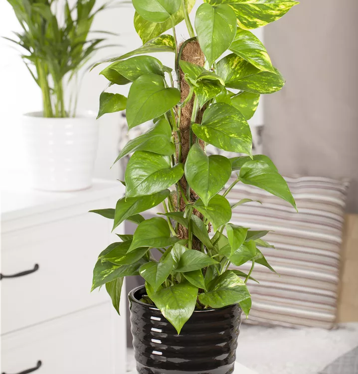Die Goldene Efeutute (Epipremnum aureum) trägt mehrfarbige, herzförmige Blätter. Diese kriechende bzw. kletternde Pflanze gedeiht am besten an einem sonnigen bis halbschattigen Standort.