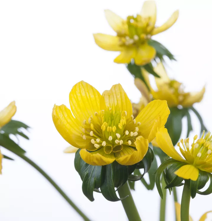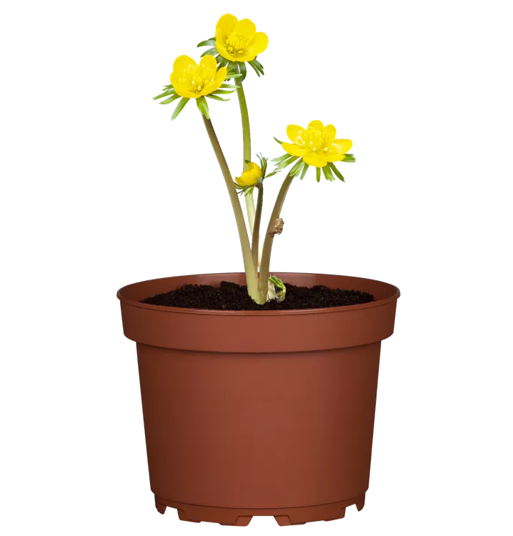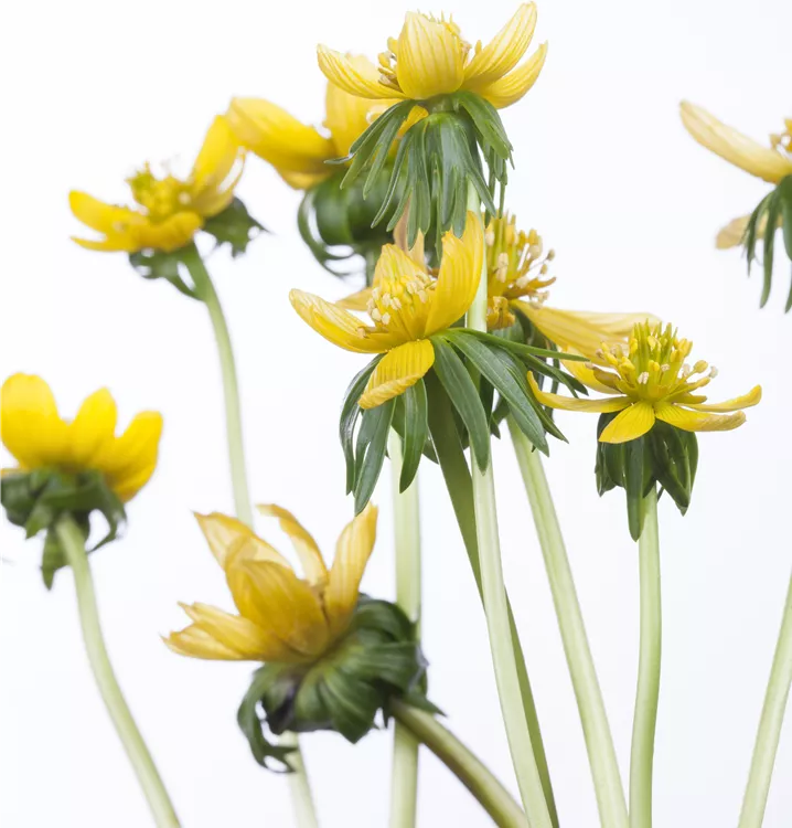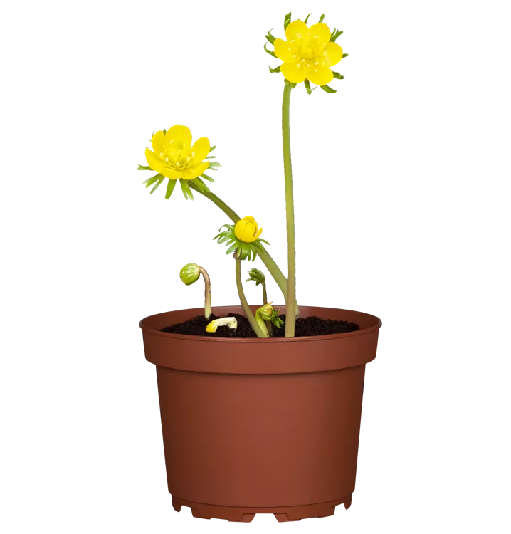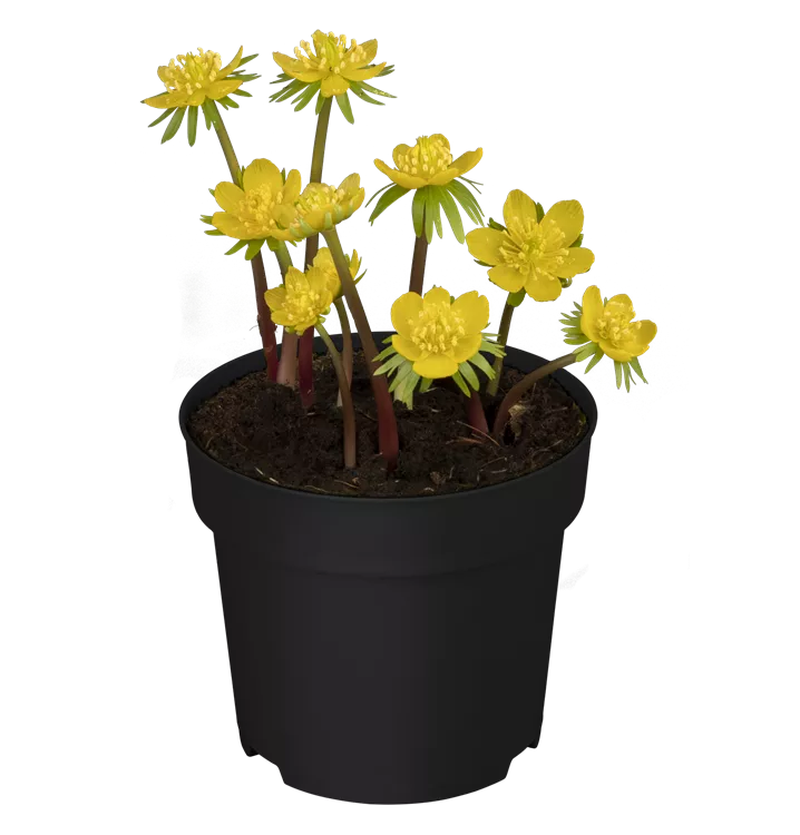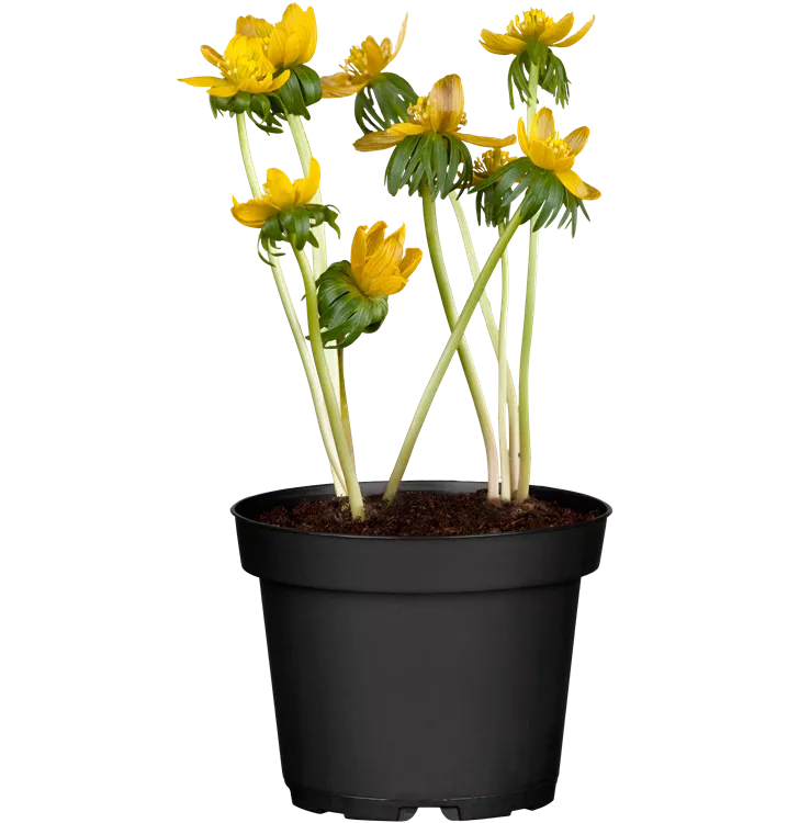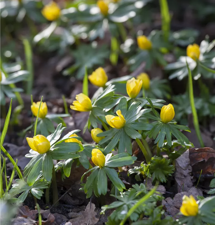 Der Winterling (Eranthis hyemalis) bringt ansehnliche, gelbe, angenehm duftende Blüten von Februar bis März hervor. Bevorzugt wird ein kalkhaltiger, lehmiger Boden in sonniger bis halbschattiger Lage. Die flache Pflanze erreicht gewöhnlich eine Höhe von 6 - 10 cm und wird bis zu 5 cm breit.