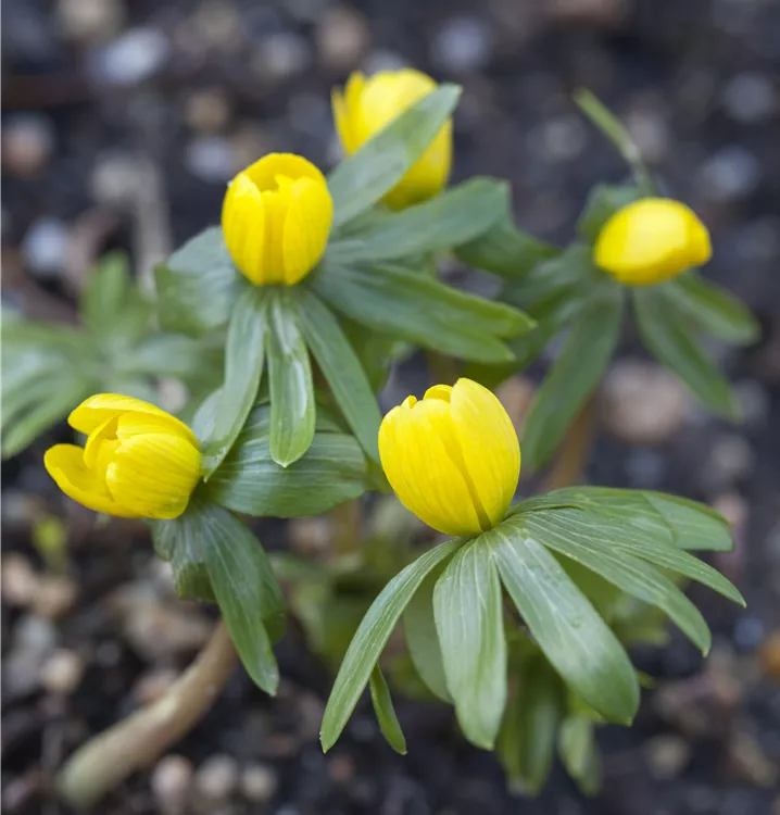 Die Blätter des Winterlings sind dunkelgrün, gefingert.