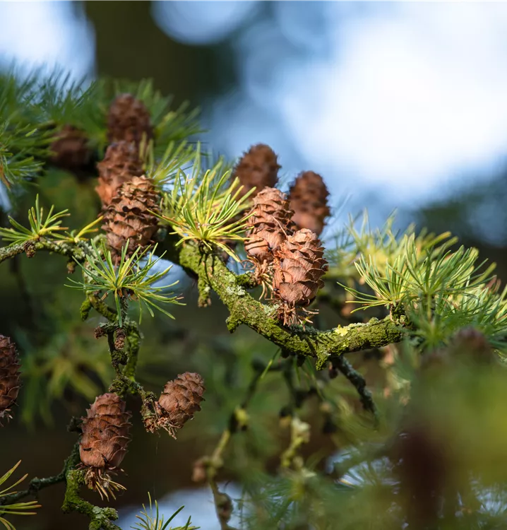 Die Europäische Lärche (Larix decidua) ist ein Großbaum, welcher kegelförmig wächst und gewöhnlich eine Höhe von ca. 35 m und eine Breite von ca. 20 m erreicht. Ihre nadelförmigen Blätter haben eine hellgrüne Färbung. Sie verwandeln sich im Herbst in ein schönes Goldgelb. Dekorative braune Zapfen zieren Larix decidua ab September. Dieses Gehölz ist gut frostverträglich.Sie bevorzugt durchlässigen, nährstoffreichen Boden in sonniger Lage.