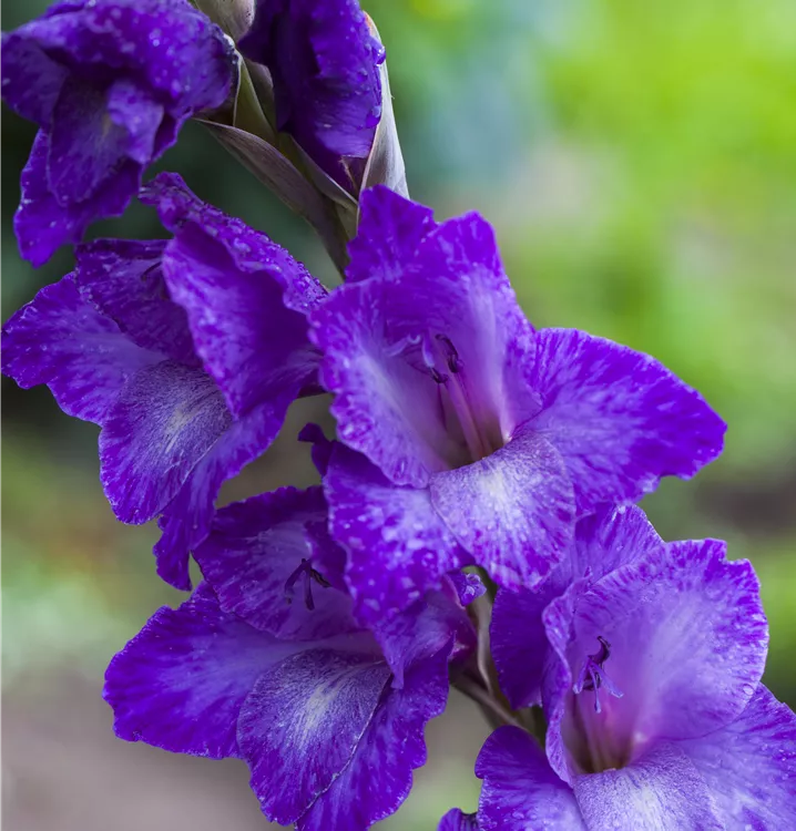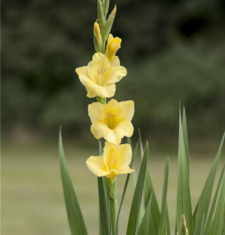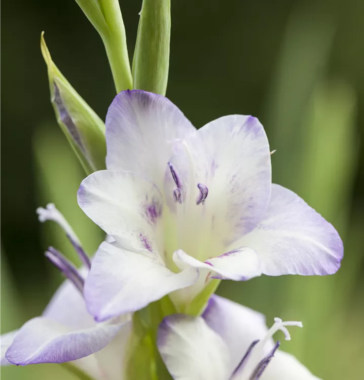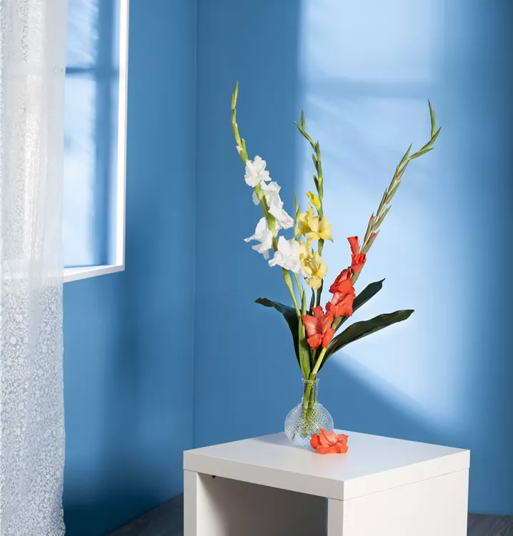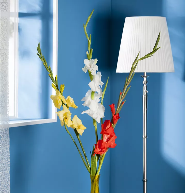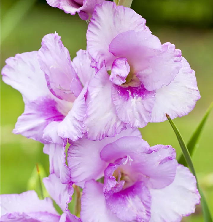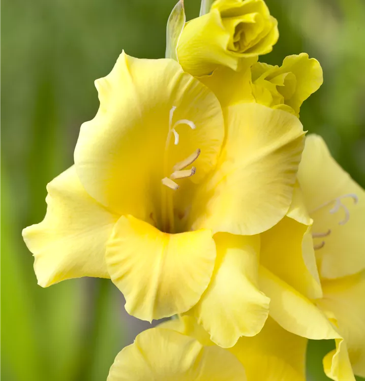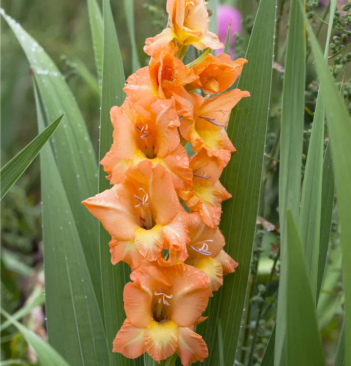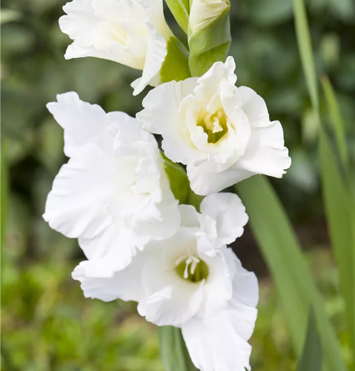 Die Gladiole (Gladiolus) bringt ansehnliche, weiße, rosafarbene, gelbe Blüten von Juli bis September hervor. Bevorzugt wird ein durchlässiger, lockerer Boden in sonniger bis halbschattiger Lage. Die aufrechte Pflanze erreicht gewöhnlich eine Höhe von 0,5 - 1,5 m und wird bis zu 15 cm breit.