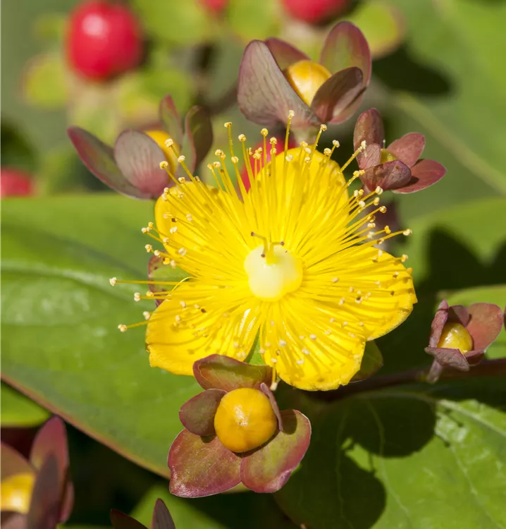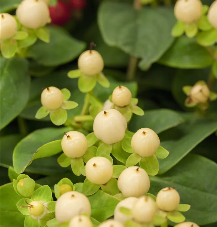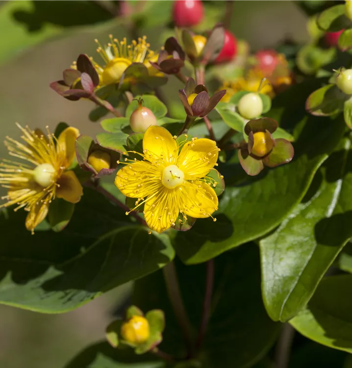 Besonders dekorativ sind die roten Früchte von Hypericum inodorum. Diese erscheinen ab September.