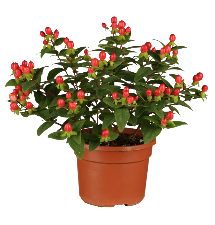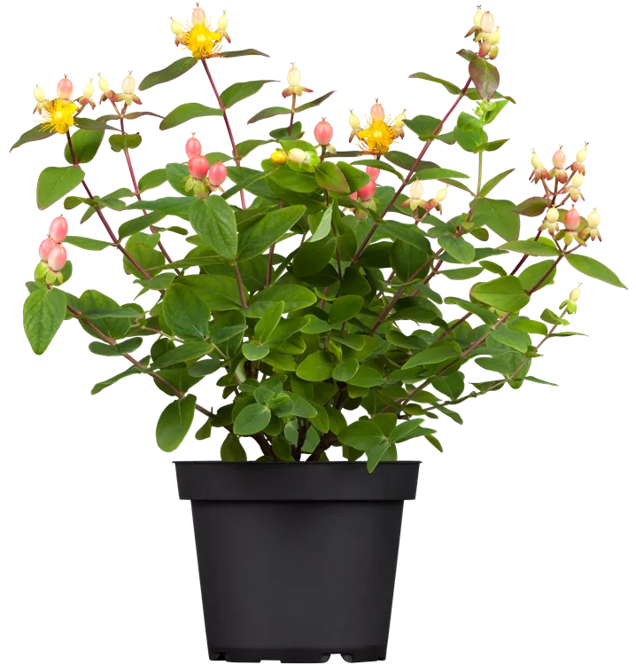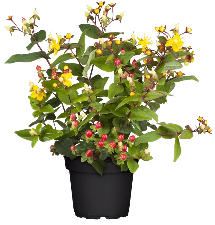 Das Johanniskraut (Hypericum inodorum) ist ein kompakter Kleinstrauch mit dekorativen, roten Früchten. Diesen voraus bringt es von Mai bis Juli gelbe oder goldgelbe Blüten hervor. Zudem trägt das Johanniskraut, lanzettliche, dunkelgrüne Blätter. An einem sonnigen bis halbschattigen Standort mit durchlässigem Boden erreicht es gewöhnlich eine Höhe von ca. 1 m und wird ca. 1 m breit.