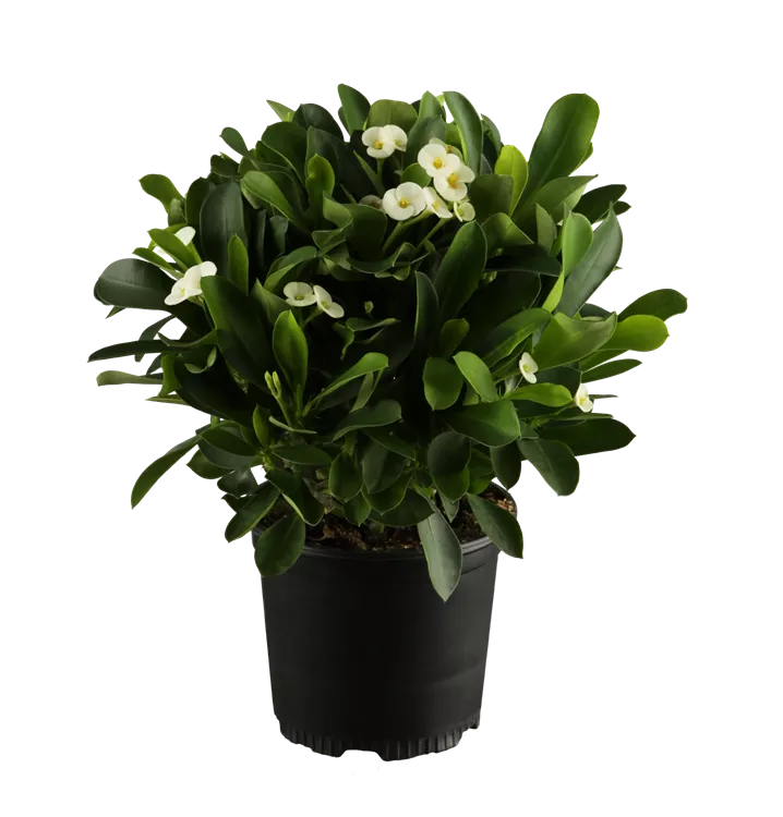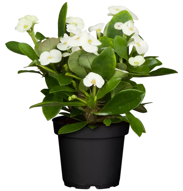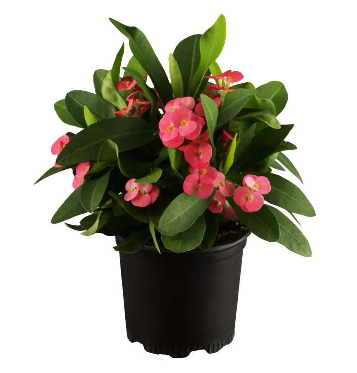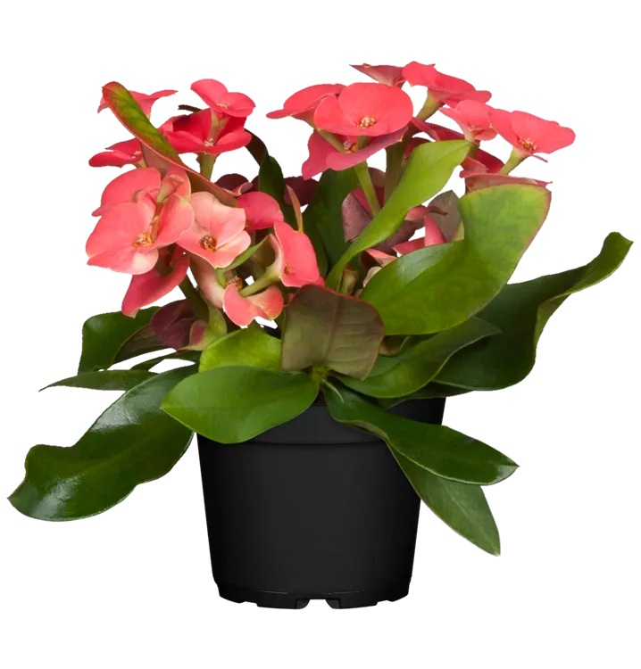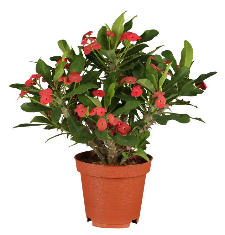 Der Christusdorn (Euphorbia milii) ist eine Pflanze mit mittelgrünen, lanzettlichen Blättern. Seine tellerförmigen Blüten sind rot und erscheinen in Trugdolden von November bis April. Diese kompakte und strauchartige Pflanze gedeiht am besten an einem sonnigen Standort.