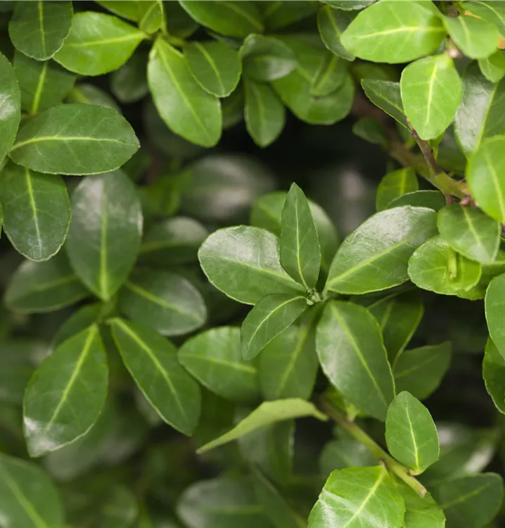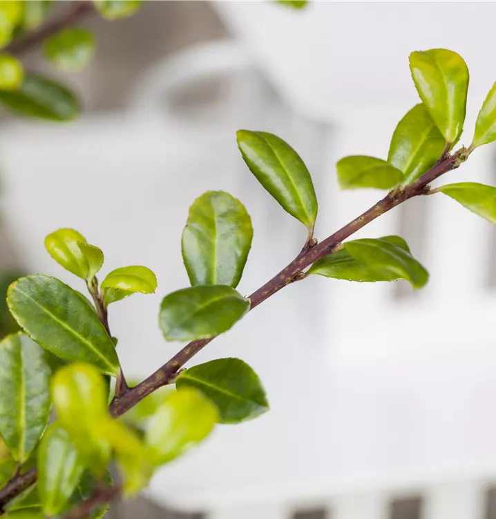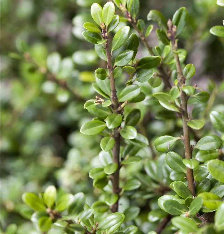 Die immergrünen Blätter der Japan-Stechpalme sind mittelgrün, rundlich, wechselständig. Diese sind etwa 2 - 3 cm groß.