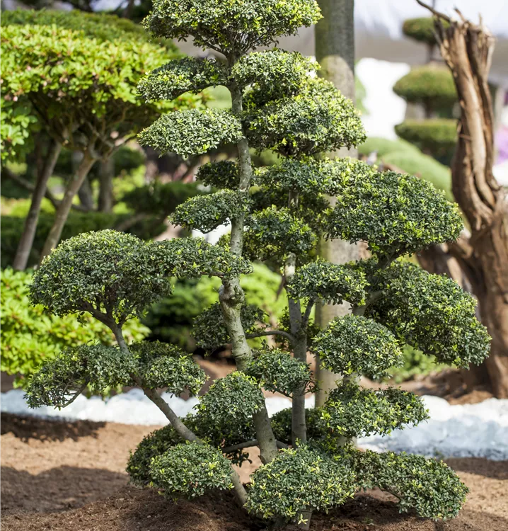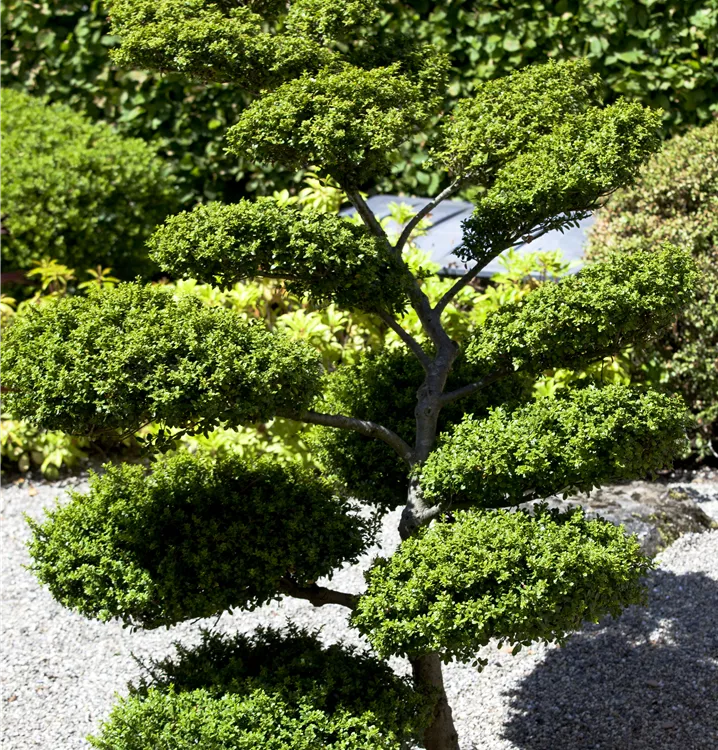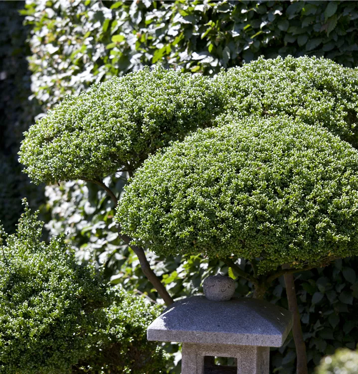 Die Japan-Stechpalme (Ilex crenata) ist ein aufrechter Strauch mit dekorativen, schwarzen Früchten, die sehr lange haften. Diesen voraus bringt sie von Mai bis Juni cremeweiße Blüten hervor. Zudem trägt die Japan-Stechpalme, rundliche, mittelgrüne Blätter. An einem sonnigen bis halbschattigen Standort mit durchlässigem, lockerem, schwachsaurem Boden erreicht sie gewöhnlich eine Höhe von ca. 3,5 m und wird ca. 2 m breit.