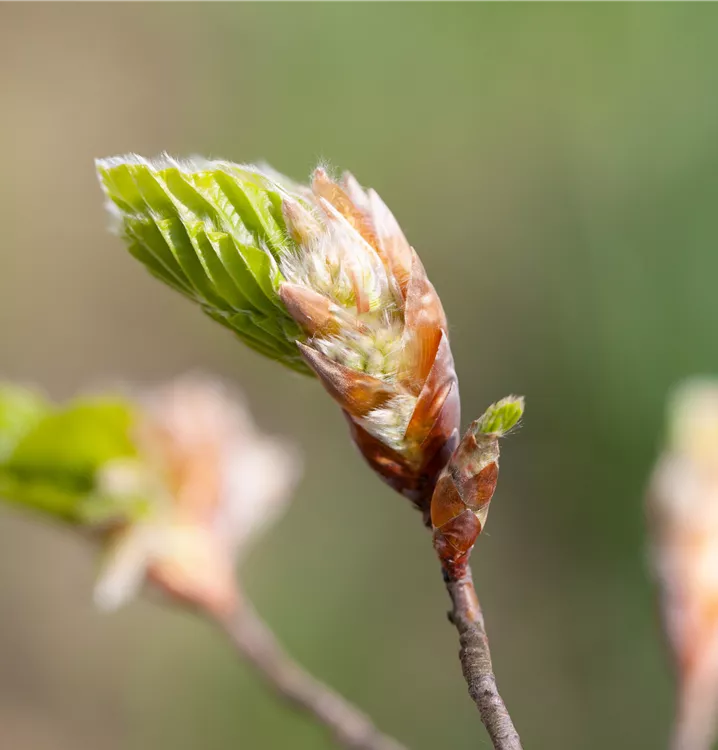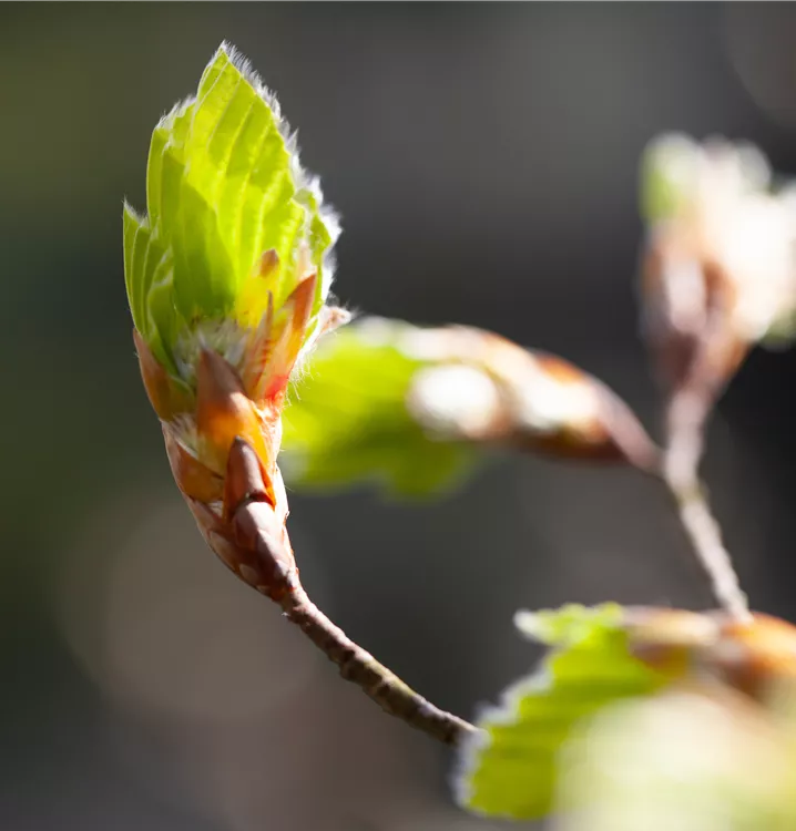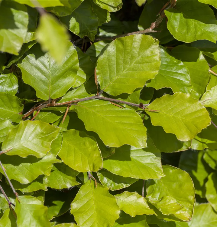 Die sommergrünen Blätter der Rotbuche sind mittelgrün, eiförmig, wechselständig, gewellt. Diese sind etwa 5 - 10 cm groß. Rotbuche zeigt sich leuchtend goldgelb im Herbst.