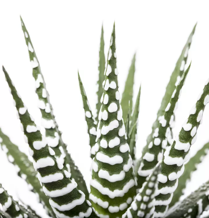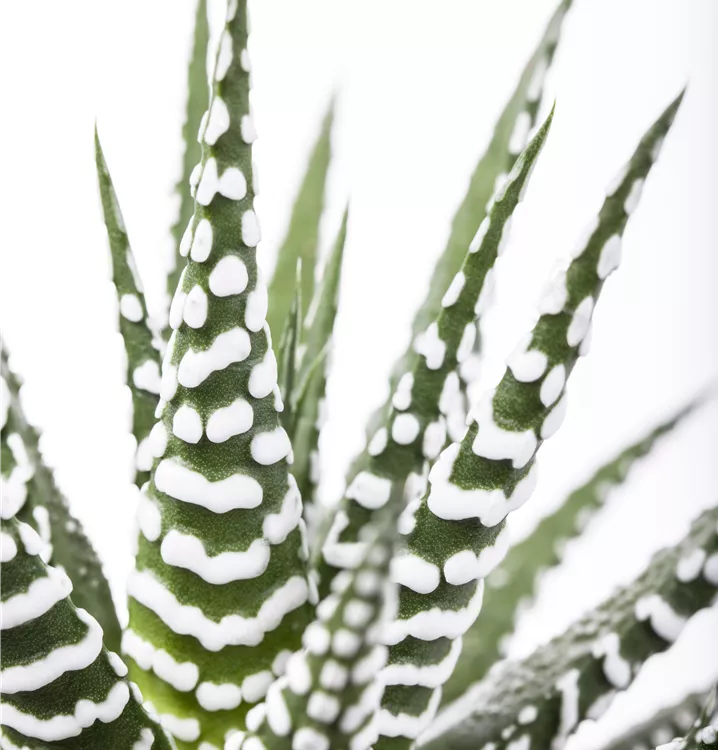 Die Blätter der Haworthie sind grün-weiß, lanzettlich, gezähnt.